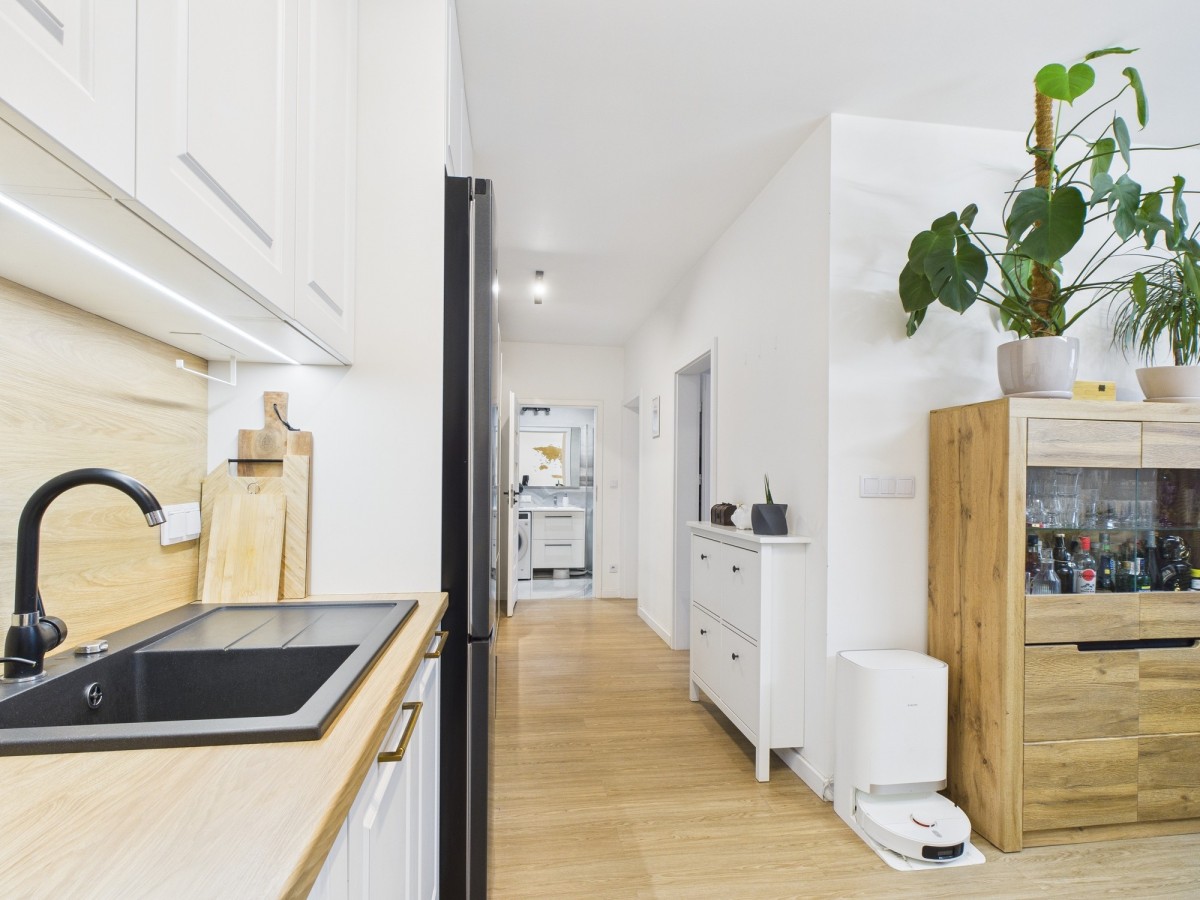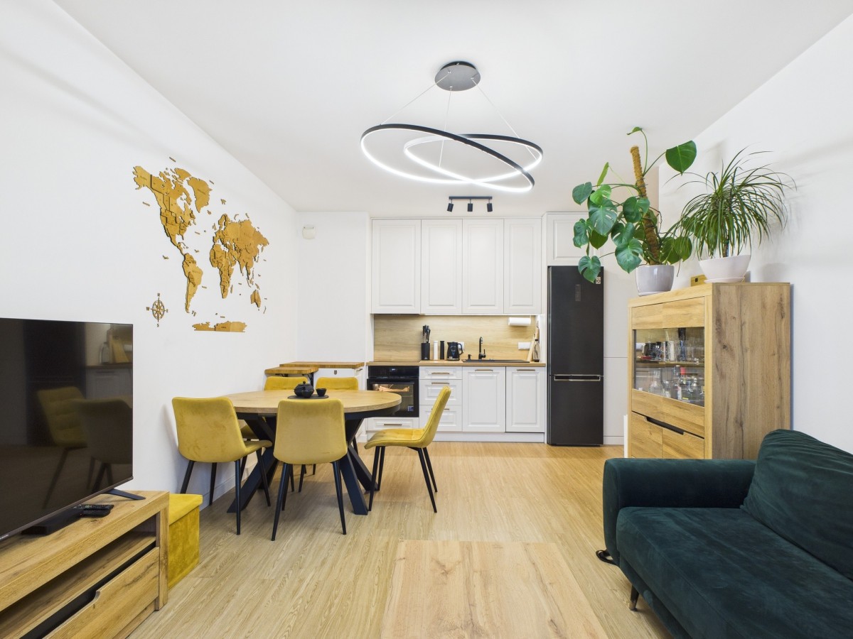 Kuchnia otwarta na salon 6m2 - lodówka, płyta grzewcza indukcyjna, piekarnik w zabudowie, zmywarka, okap, liczne szafki, stół kuchenny z krzesłami.