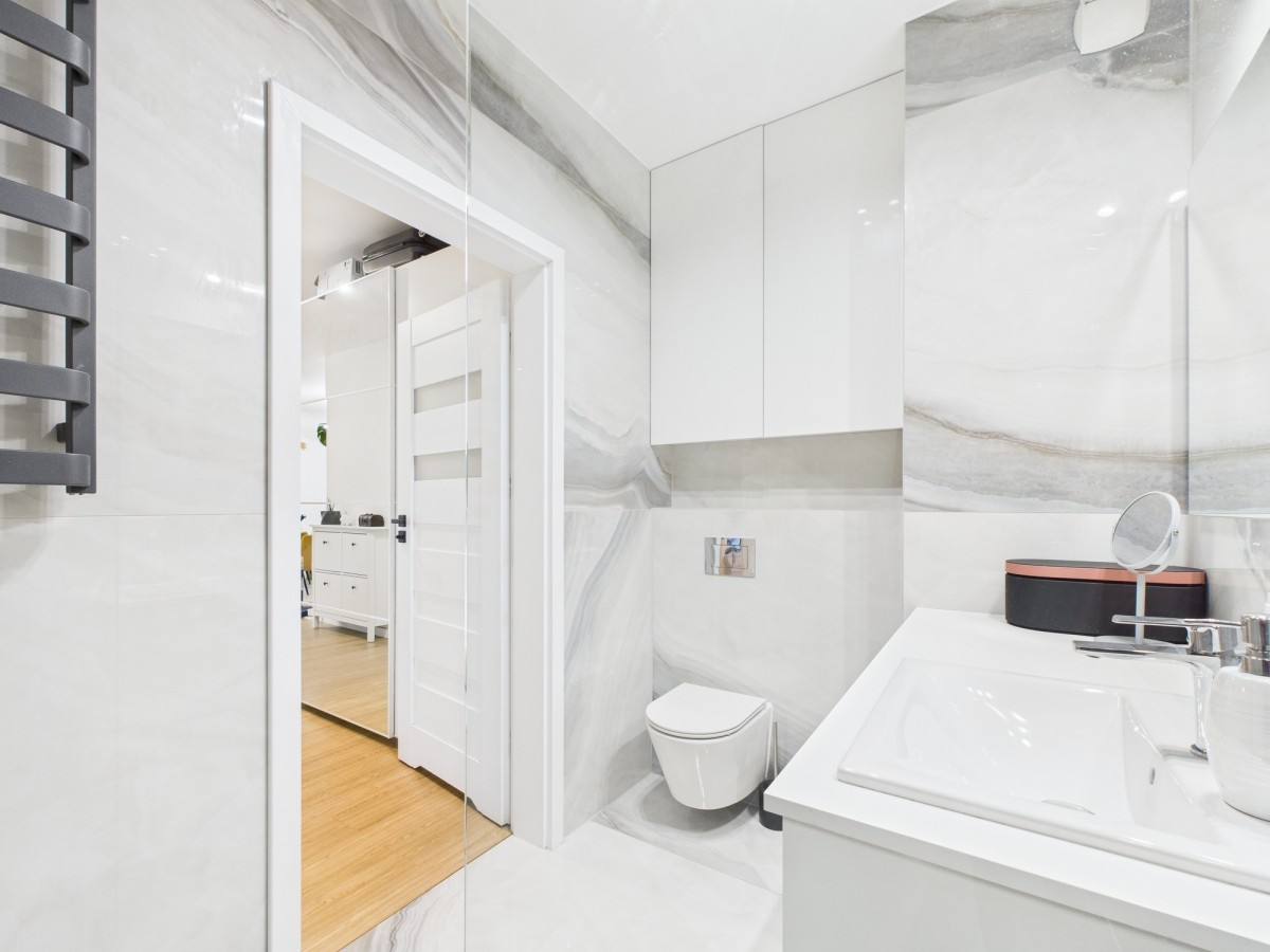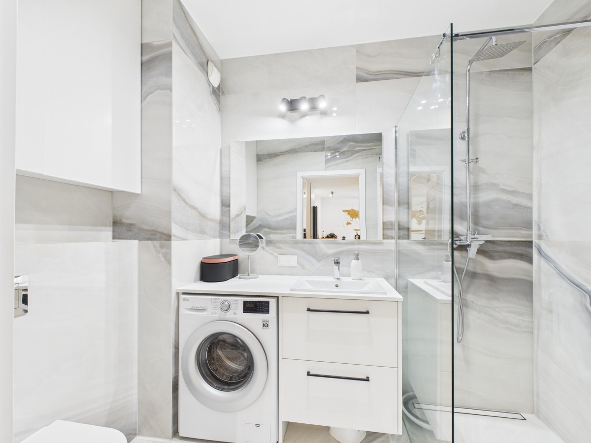 Łazienka 4,5m2 - prysznic, umywalka, szafka, pralka, wc, grzejnik drabinkowy.