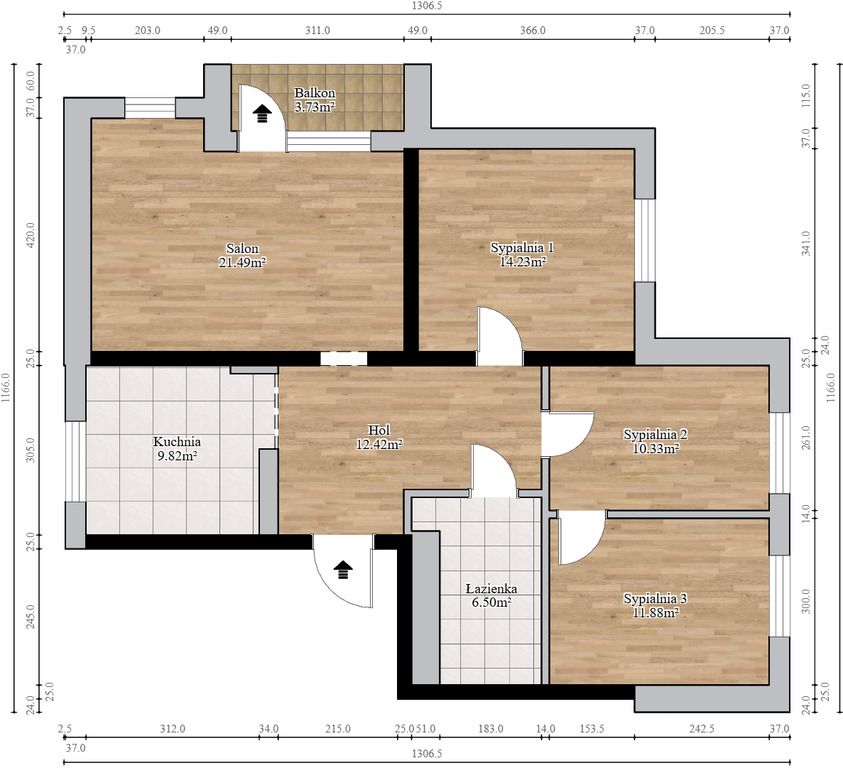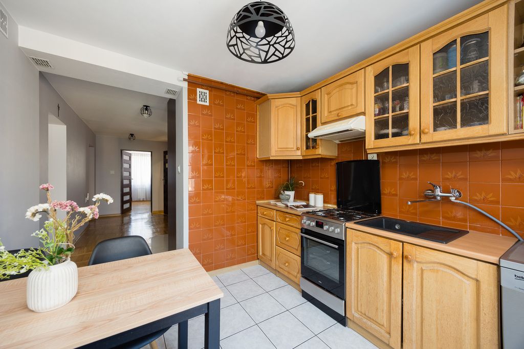 Funkcjonalny układ, osobna kuchnia i dużo światła dzięki oknom na trzy strony świata.