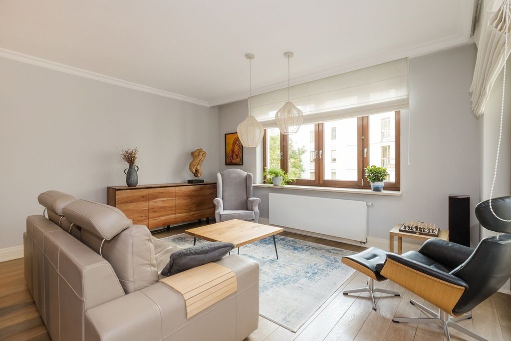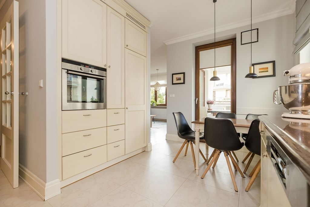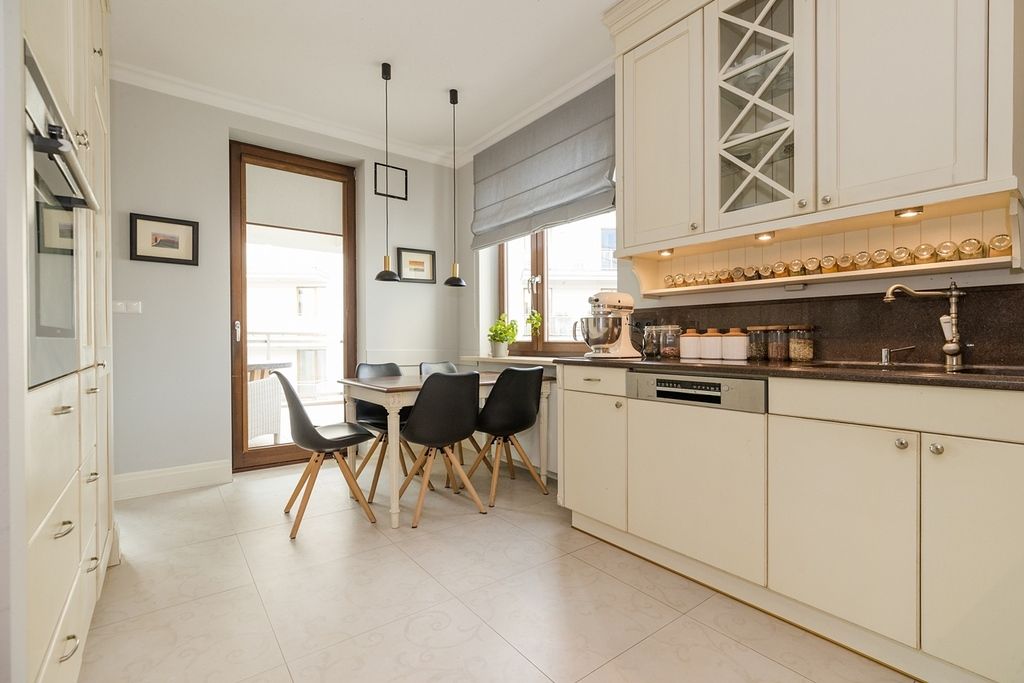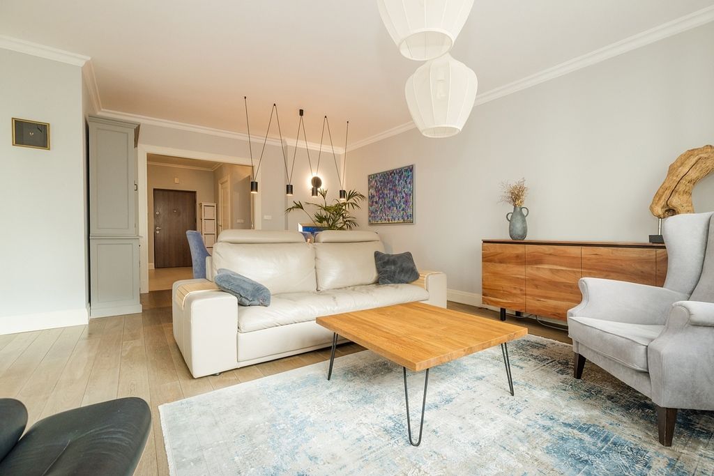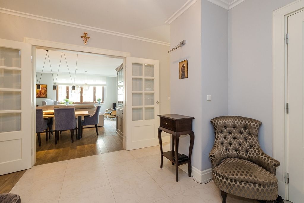 Wnętrze apartamentu charakteryzuje się klasyczną elegancją połączoną z funkcjonalnym i jasnym designem. Cała przestrzeń jest widna i przestronna dzięki dużym oknom, w tym oknom balkonowym, które wpuszczają dużą ilość naturalnego światła.