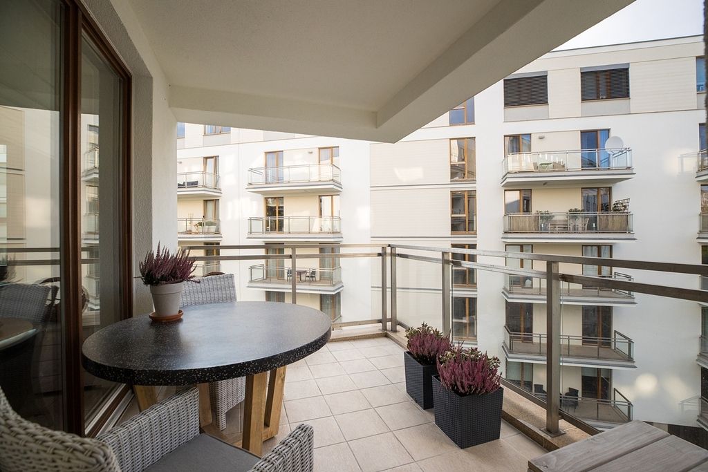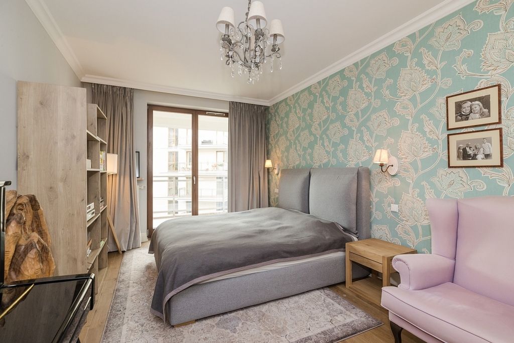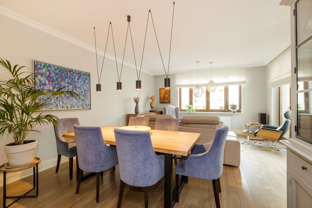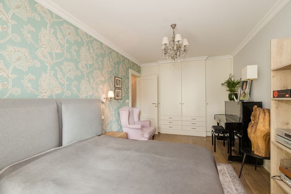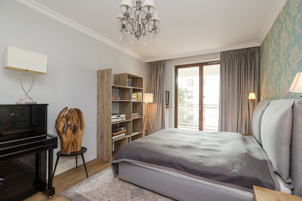 Wnętrze apartamentu charakteryzuje się klasyczną elegancją połączoną z funkcjonalnym i jasnym designem. Cała przestrzeń jest widna i przestronna dzięki dużym oknom, w tym oknom balkonowym, które wpuszczają dużą ilość naturalnego światła.