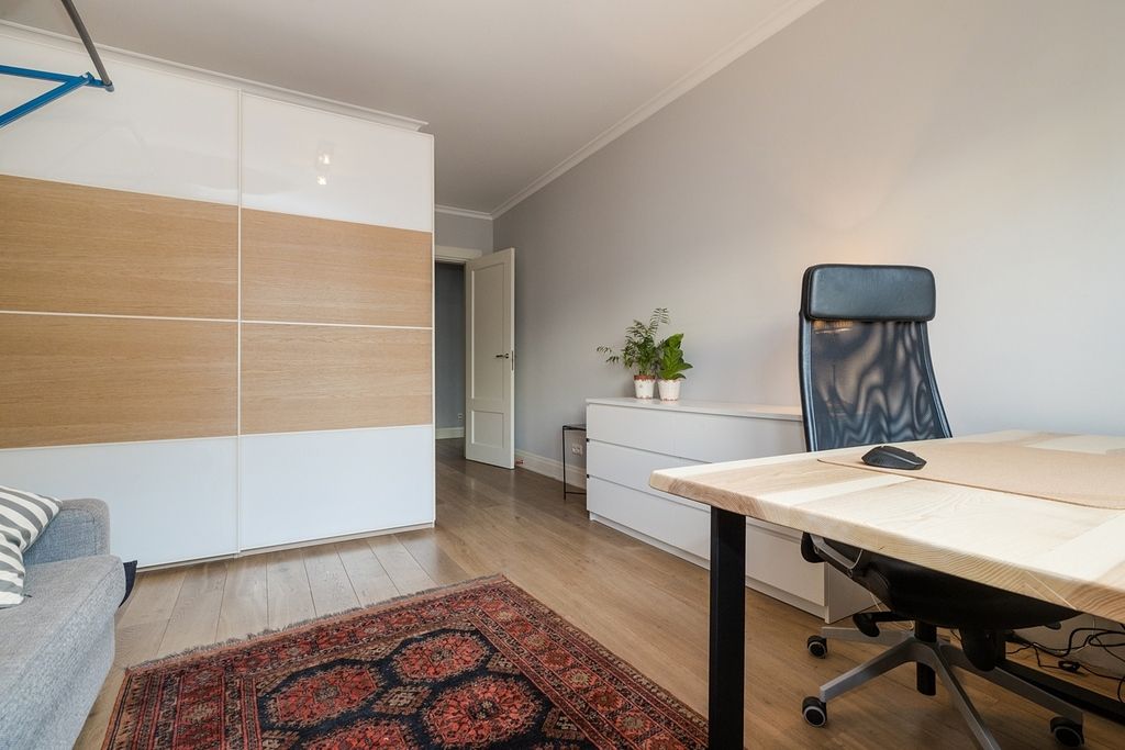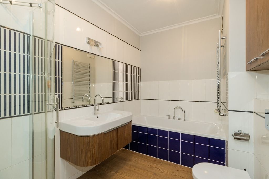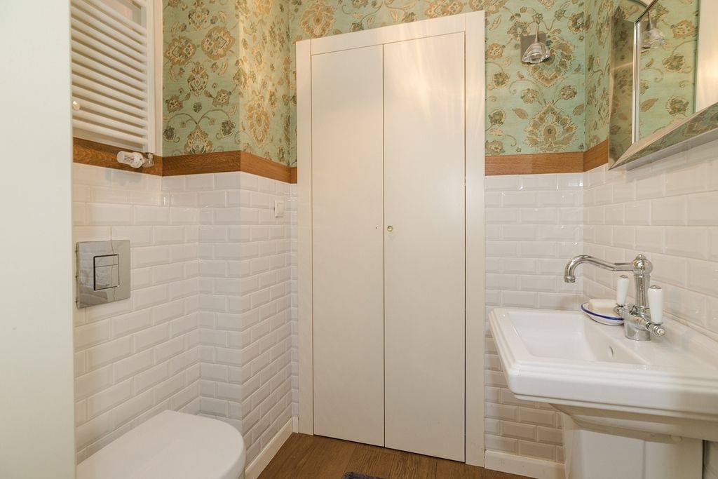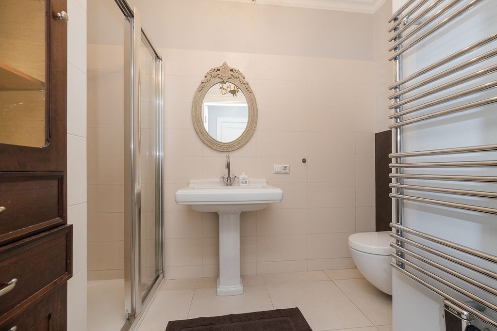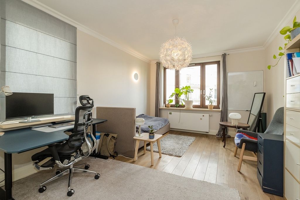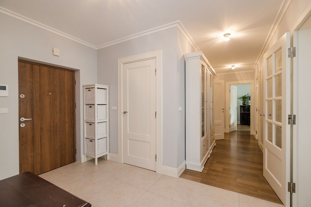 O wysokim standardzie wykończenia świadczą: klasyczna drewniana podłoga, stylowa sztukateria przy suficie oraz wysokie listwy przypodłogowe.