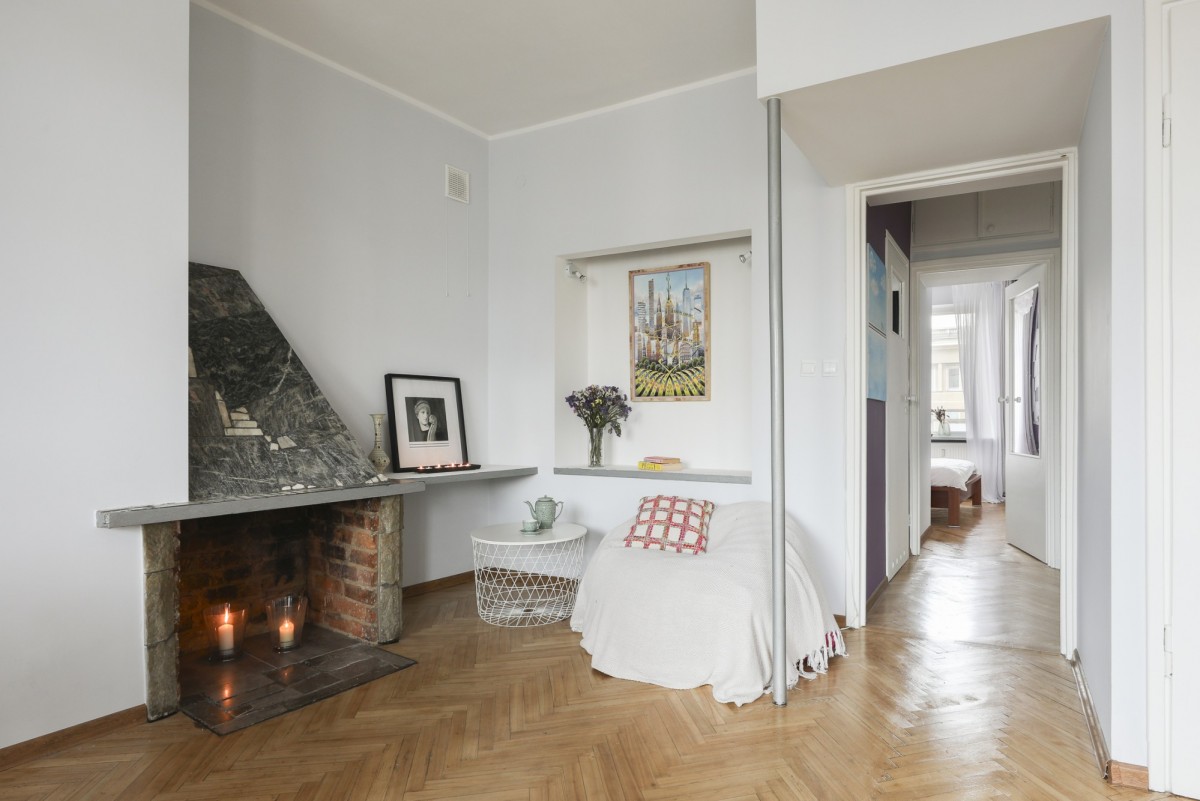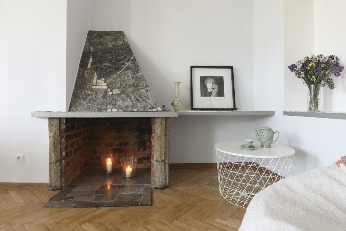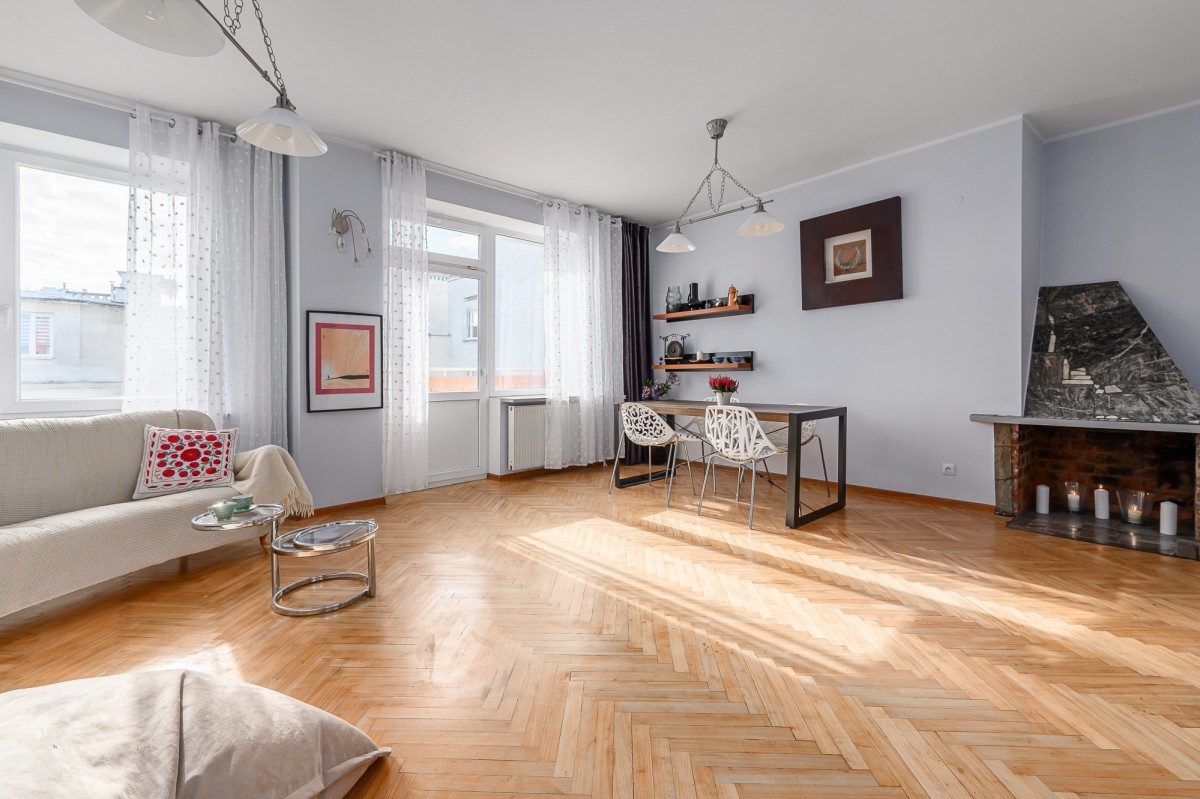 Salon z kominkiem (32 m²) usytuowany od strony południowej wychodzi na ciche, zielone podwórze - wnętrze jest jasne, spokojne i pełne naturalnego światła.