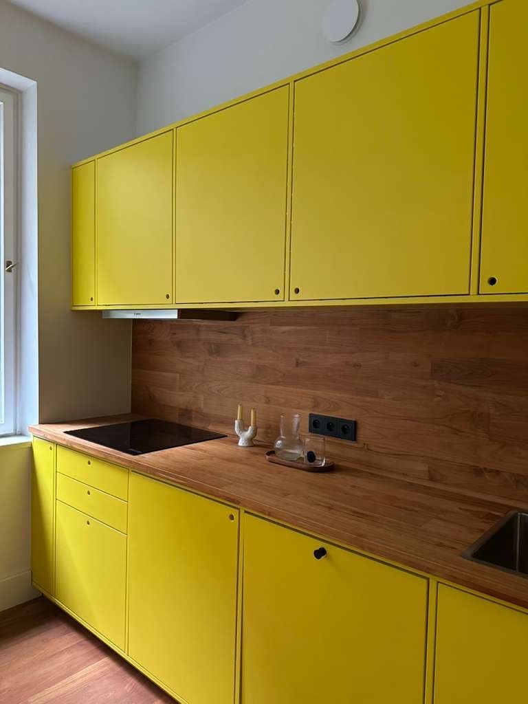 Kuchnia - z meblami w zabudowie wykonanymi na wymiar, utrzymana w energetycznym, żółtym kolorze. Wyposażona w piekarnik, zmywarkę oraz pralkę. Przestronna i funkcjonalna, stanowi idealne miejsce spotkań przy wspólnych posiłkach.