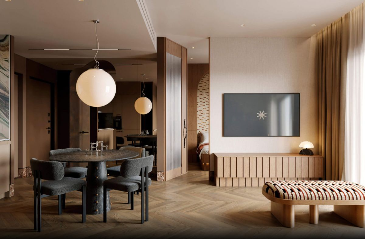 Wnętrza utrzymane są w eleganckiej stylistyce modernizmu i art déco - jasne tonacje drewna i kremowych tkanin kontrastują z ciemnym orzechem, antracytem i brązem, tworząc atmosferę wyrafinowanego luksusu.