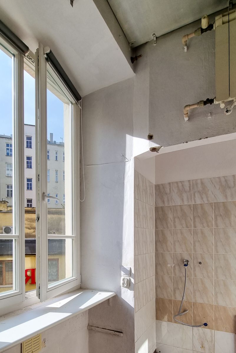 Lokal o powierzchni niespełna 26m2 znajduje się na pierwszym piętrze do którego wejdziemy wygodnymi schodami. Jego okna wychodzą na spokojne wewnętrzne patio od strony południowej gdzie znajdują się również lokale użytkowe. Poczucie przestrzeni potęguje wysokość mieszkania która wynosi około 350cm. Mieszkanie ma duży potencjał - można stworzyć tu funkcjonalną, komfortową przestrzeń pod wynajem lub dla siebie. Bardzo ciekawa propozycja na siedzibę firmy. Prestiżowy adres, zadbana kamienica i funkcjonalny układ sprzyjają prowadzeniu dochodowego biznesu. W ofercie zobrazowany jest zoptymalizowany układ mieszkania obrazujący jego przykładowy potencjał aranżacyjny: dwa pokoje. Stan: do generalnego remontu.