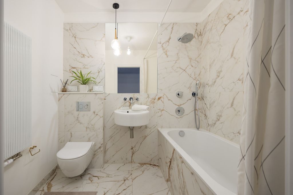 W łazience, w której możemy w pełni zrelaksować się po intensywnym dniu, znajduje się wysokiej klasy wanna marki Villeroy & Boch oraz włoski gres z ogrzewaniem podłogowym, zapewniający wyjątkowy komfort użytkowania.