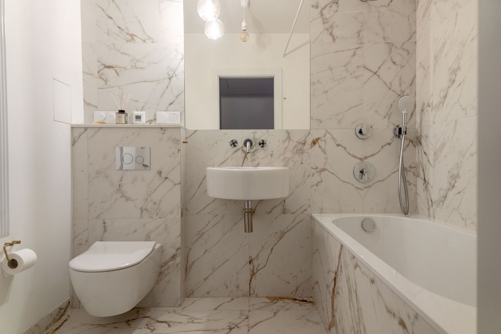 The bathroom features a Villeroy & Boch bathtub, Italian porcelain tiles, and underfloor heating.