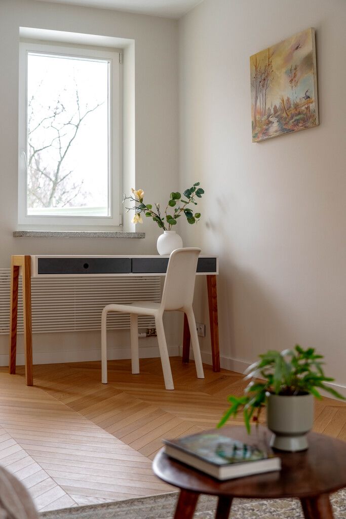 The functional layout makes the apartment ideal both for living and working. Thanks to its east–west exposure and two balconies, the interior is filled with natural light throughout the day.