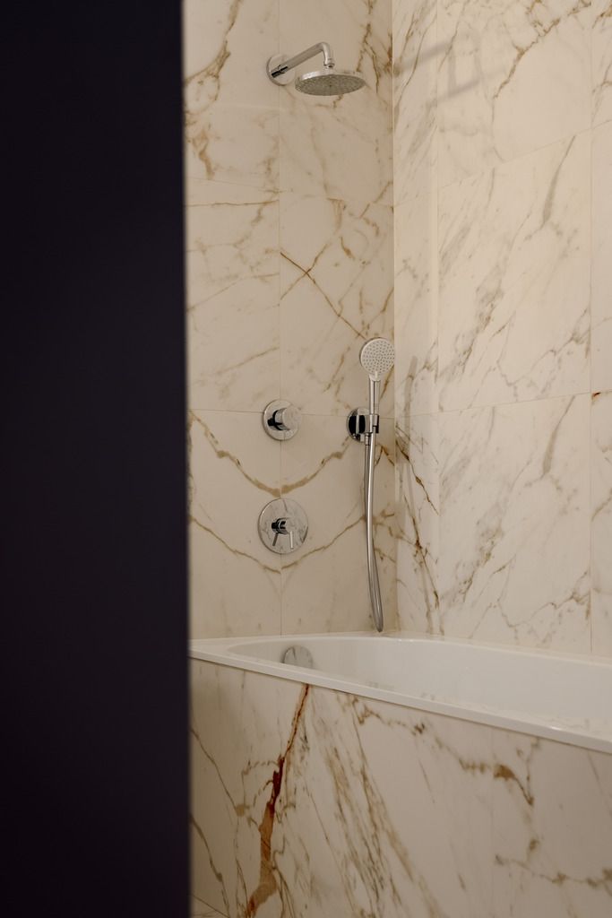 W łazience znajduje się wanna Villeroy & Boch oraz włoski gres z ogrzewaniem podłogowym.