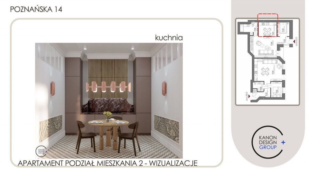Lokal znajduje się na pierwszym piętrze, posiada balkon z widokiem na wewnętrzne patio oraz dużą piwnicę o wielkości 12 m². Mieszkanie wymaga remontu, ale posiada dwa niezależne wejścia dające możliwość na stworzenia jednego eleganckiego apartamentu czy wydzielenie dwóch niezależnych lokali. Kamienica jest przed procesem pełnej rewitalizacji prowadzonej przez FENIX Group, z planowanym rozpoczęciem w 2026 roku, co znacząco podniesie standard budynku.