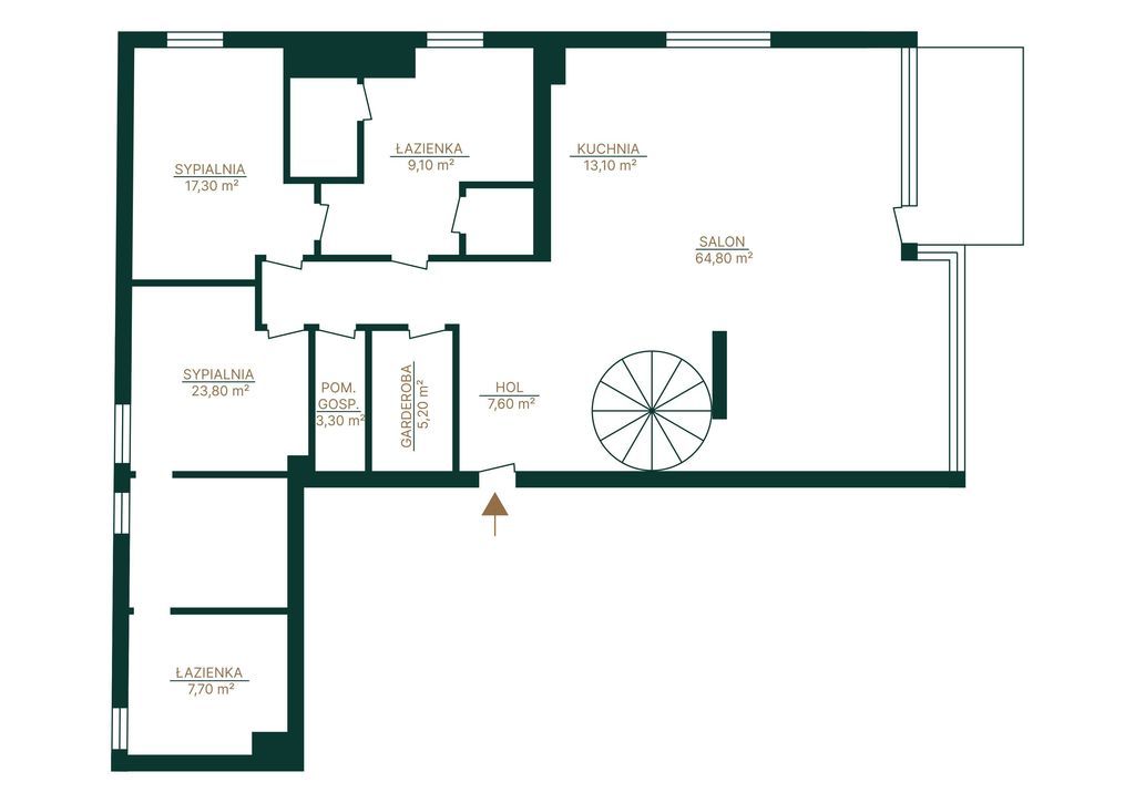 Living room with kitchenette and dining room 78m2, master bedroom with dressing room and bathroom 33m2, second bedroom 17m2, bathroom, dressing room 5m2 and utility room 3m2.