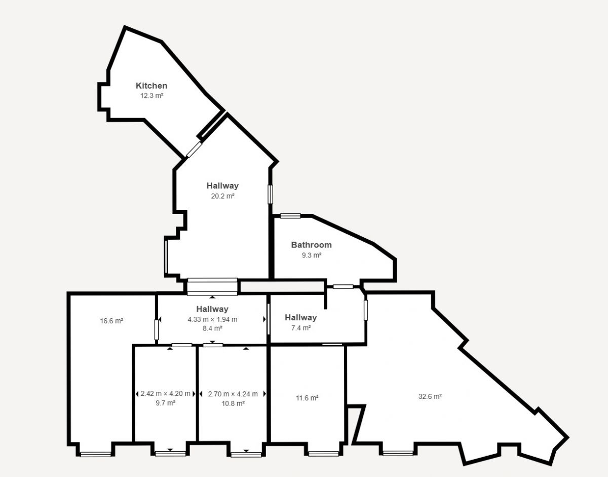 - Oryginalny układ mieszkania przed remontem obejmował dużą, otwartą przestrzeń — salon z 7 dużymi oknami, w tym drzwiami prowadzącymi na balkon od strony Polnej, co zapewnia znakomite doświetlenie i wyjątkową atmosferę.