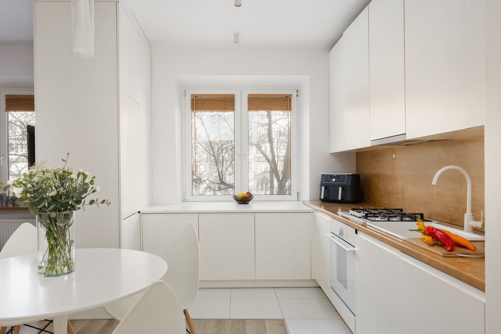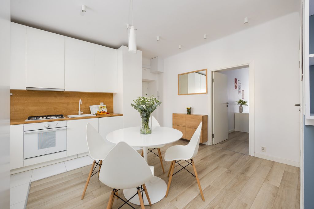 -na podłogach panele oraz płytki, kuchnia w zabudowie stolarskiej