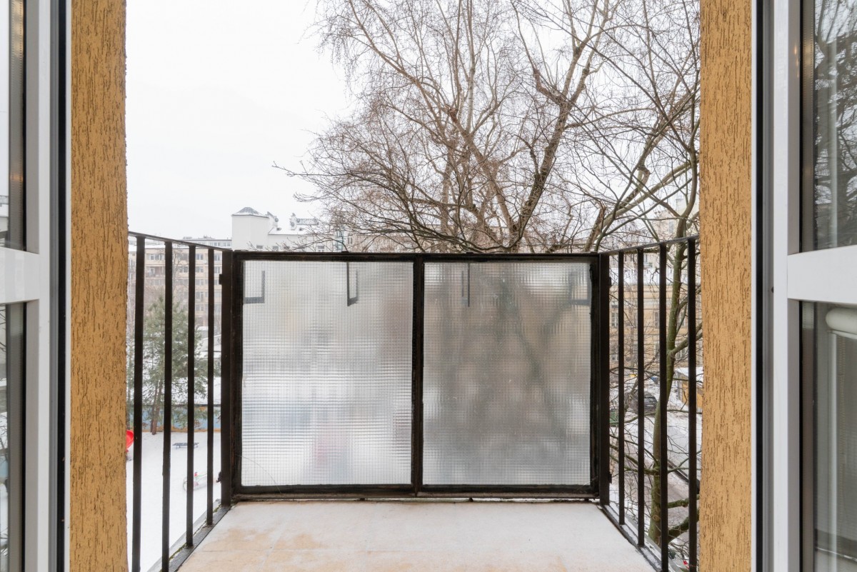 The apartment is located on the 3rd floor of an 8-storey building. It consists of two separate rooms, a kitchen with an internal window facing one of the rooms, a bathroom and a hallway. The total area is 35.89 m². Ceiling height is 2.70 m. District heating is provided. The apartment includes a balcony and a basement storage unit. Windows face a green, internal courtyard, making the apartment quiet.