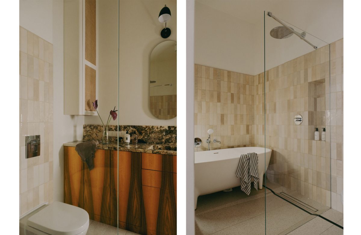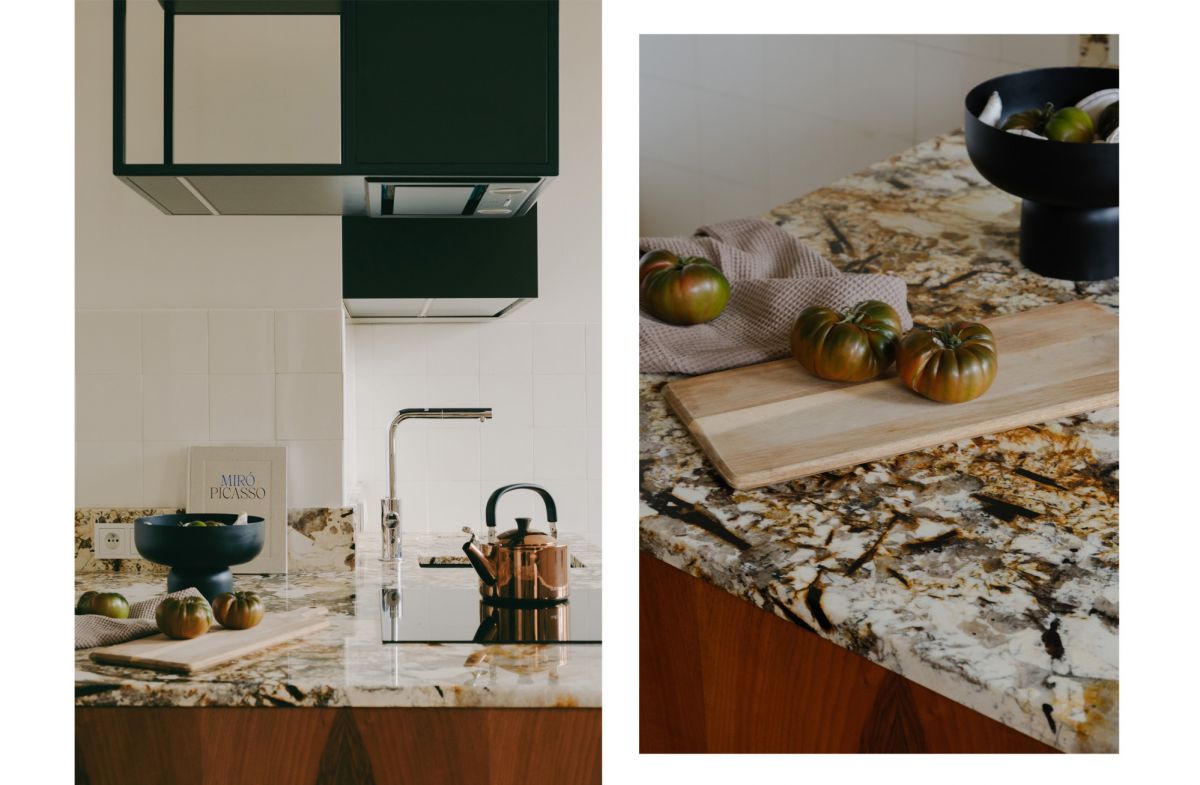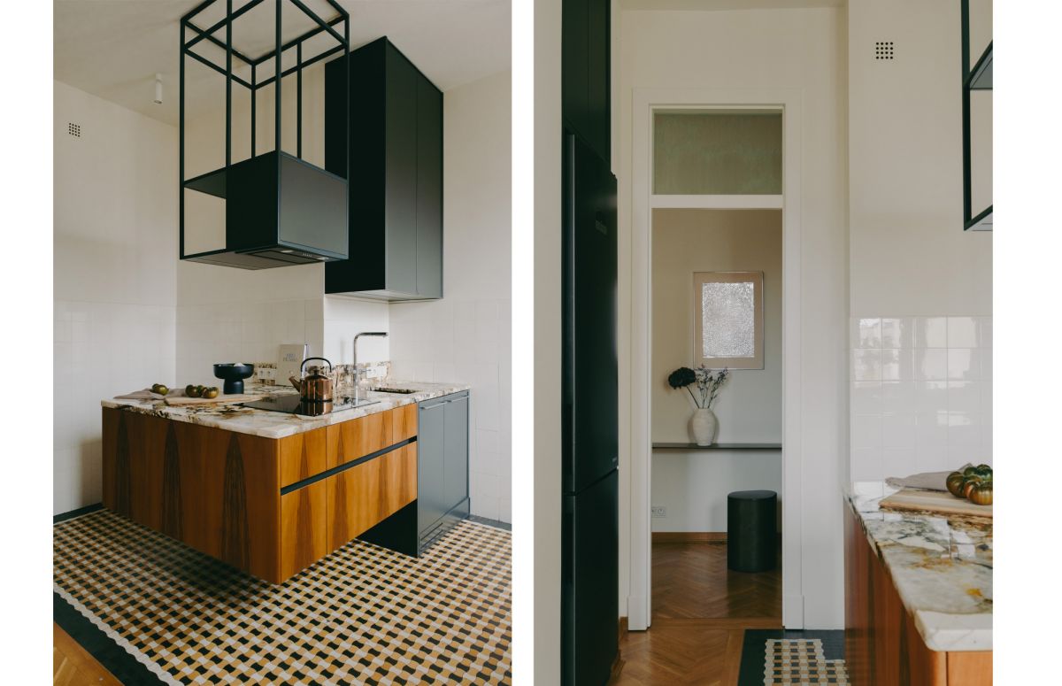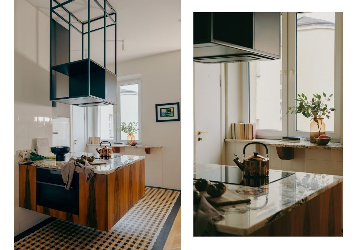 Część dzienna stanowi otwartą, jasną przestrzeń z bezpośrednim wyjściem na balkon, płynnie połączoną z kuchnią, która została potraktowana jako serce domu. Rzeźbiarska zabudowa kuchenna, częściowo podwieszona, eksponuje oryginalną, przedwojenną mozaikę podłogową, starannie odrestaurowaną z zachowaniem historycznych detali. Blat wykonany z naturalnego kwarcytu Patagonia zapewnia dużą powierzchnię roboczą i sprzyja wspólnemu gotowaniu.