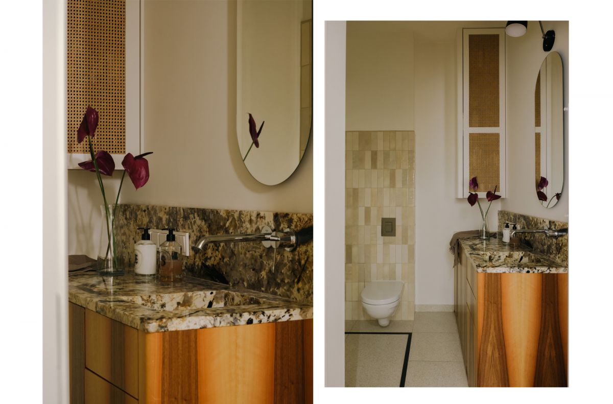 The living area is an open, bright space with direct access to a balcony, seamlessly connected to the kitchen, which has been conceived as the heart of the home. The sculptural kitchen cabinetry, partially suspended, reveals the original pre-war mosaic flooring, meticulously restored with attention to historical detail. A natural Patagonia quartzite countertop offers generous workspace and encourages shared cooking and social interaction.