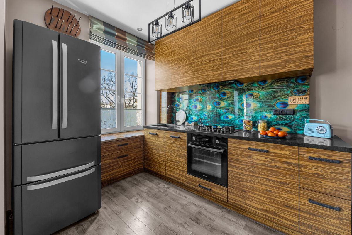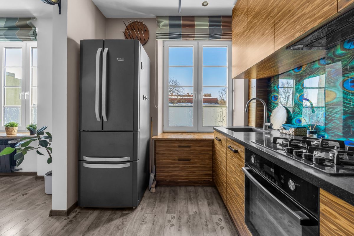 - pełne wyposażenie w sprzęt AGD: lodówka dwudrzwiowa, płyta gazowa, piekarnik, zmywarka, pralka,