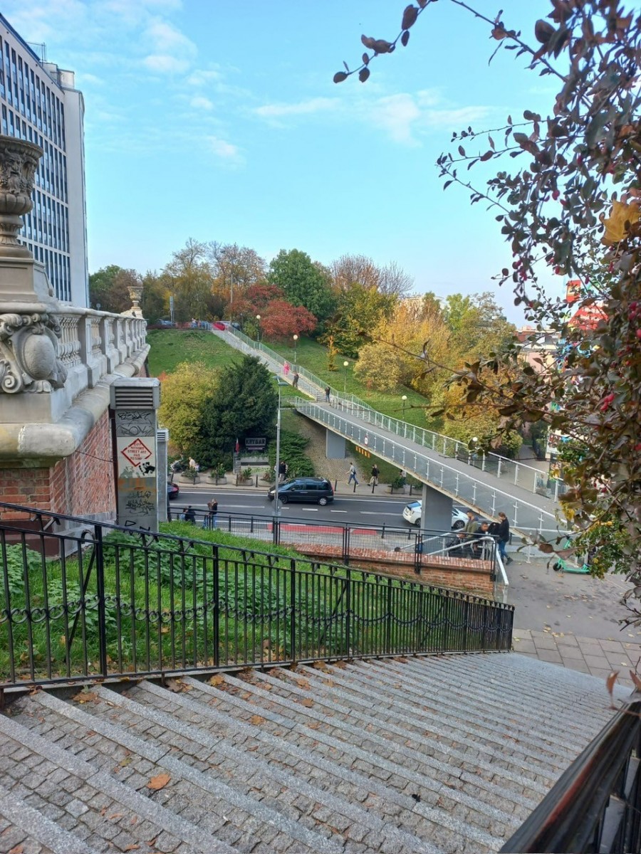 Przy ulicy Tamka z widokiem na Zieloną Skarpę Wiślaną i ulicę Dynasy z piękną panoramą Pałacu Ostrogskich, siedzibą Narodowego Instytutu i Muzeum Fryderyka Chopina.