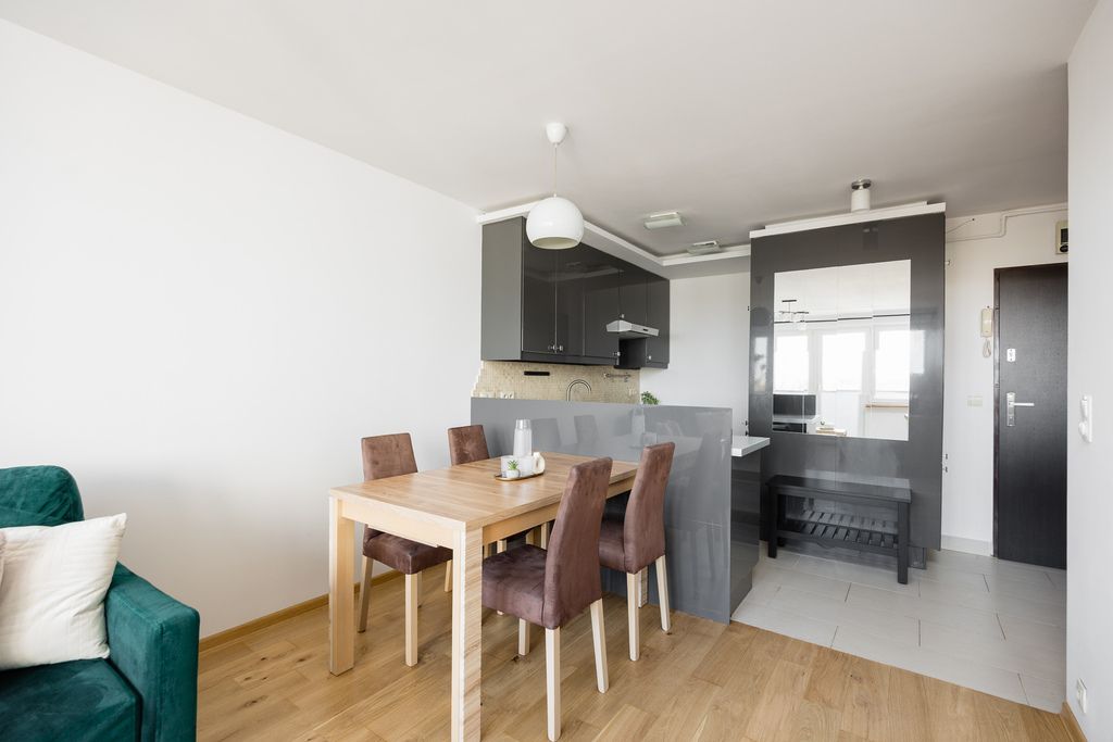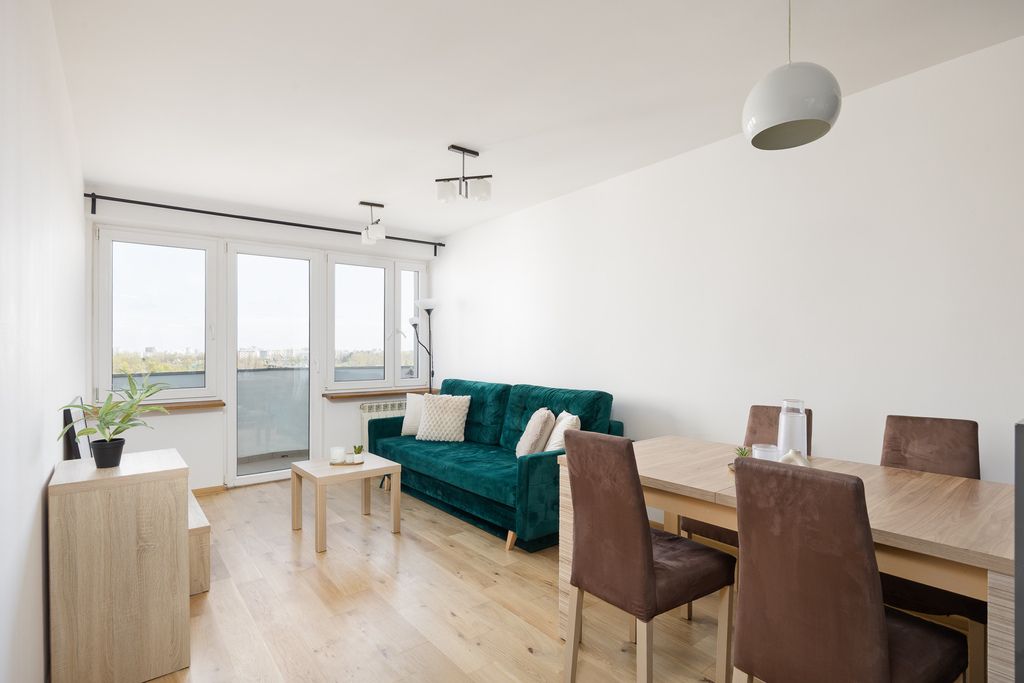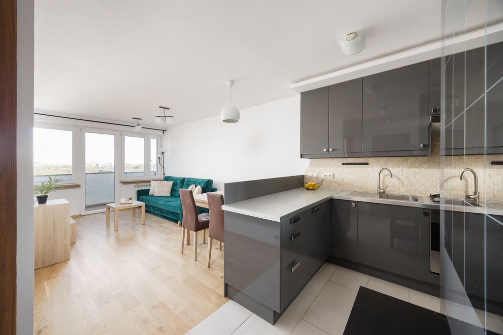 Gotowe do zamieszkania, dwupokojowe mieszkanie z balkonem i widokiem na Wisłę, położone na dziewiątym piętrze szesnastopiętrowego budynku z windą z 1968 roku, zlokalizowane na warszawskim Powiślu przy ul. Fabrycznej 2.