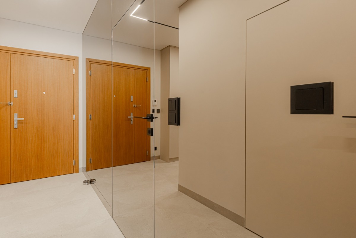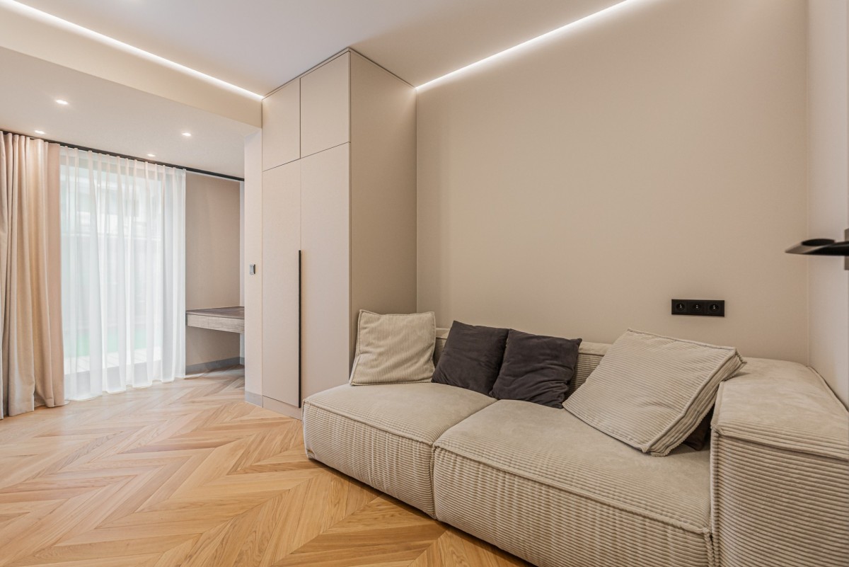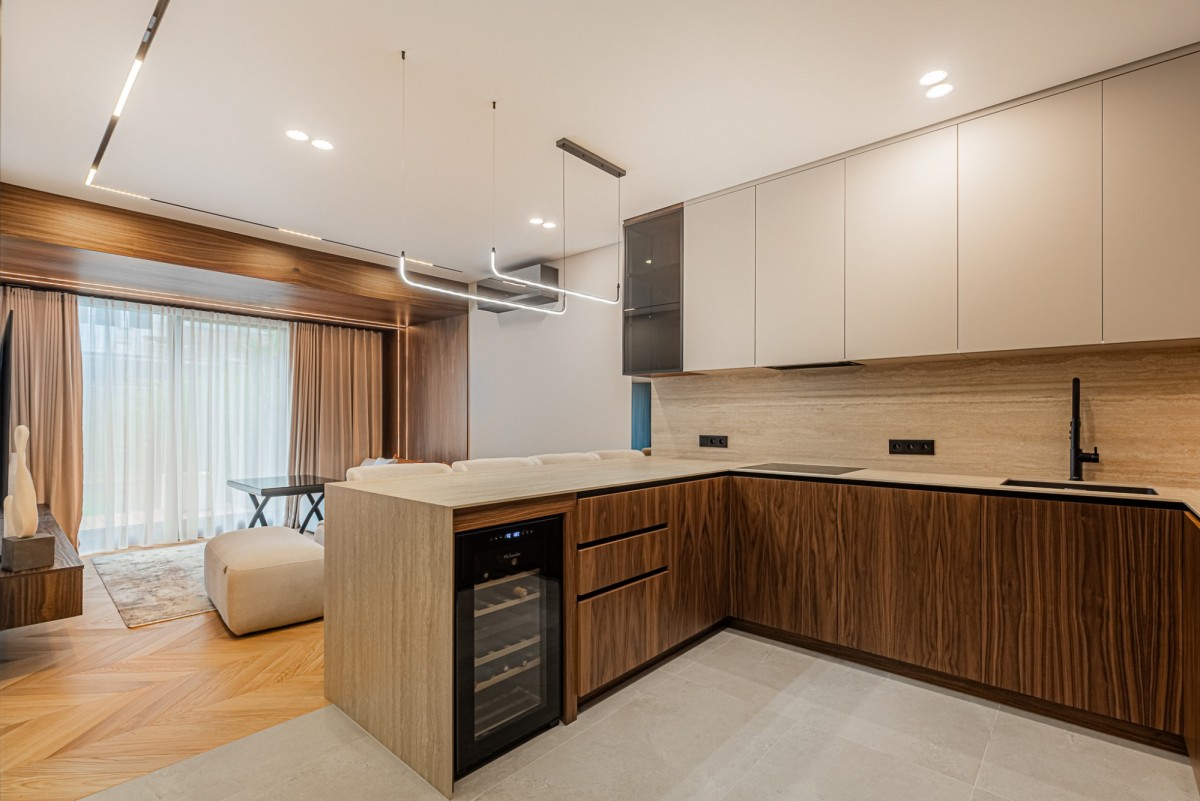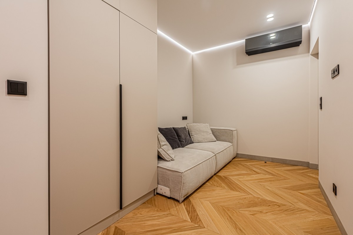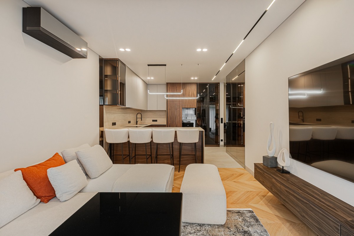 Apartament został wykończony w wysokim standardzie pod nadzorem architekta wnętrz. Wnętrze jest nowoczesne, spójne i gotowe do wprowadzenia. Nieruchomość wyposażona jest w wysokiej klasy sprzęt AGD, klimatyzację oraz lodówkę na wino.