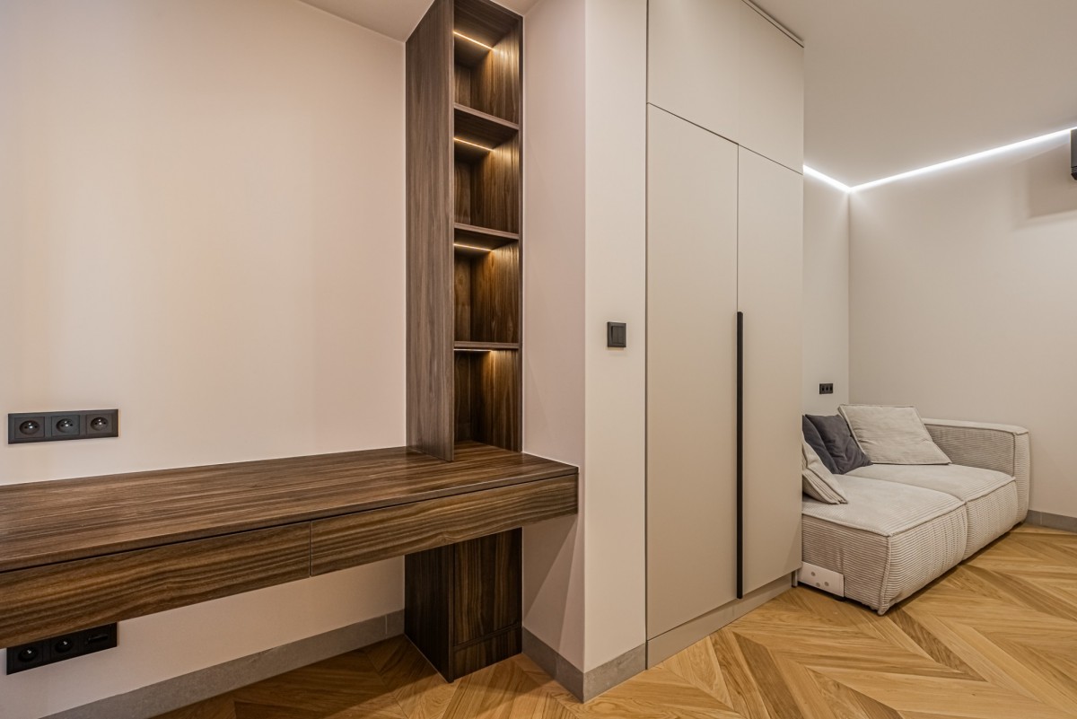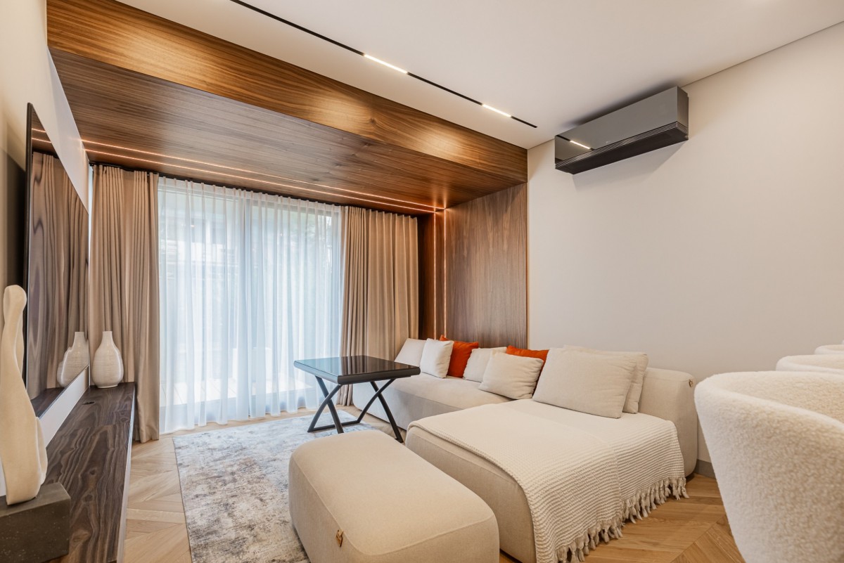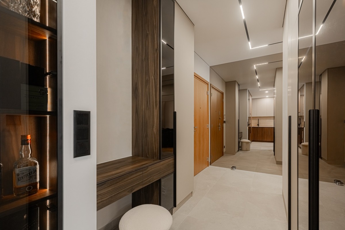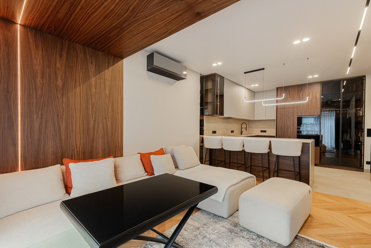 Apartament został wykończony w wysokim standardzie pod nadzorem architekta wnętrz. Wnętrze jest nowoczesne, spójne i gotowe do wprowadzenia. Nieruchomość wyposażona jest w wysokiej klasy sprzęt AGD, klimatyzację oraz lodówkę na wino.