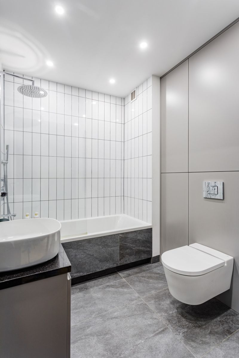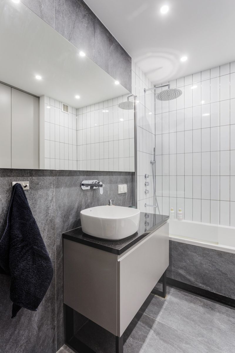 łazienka — 3,5 m² (z wanną i szybą prysznicową, pojemną zabudową i szafkami)
