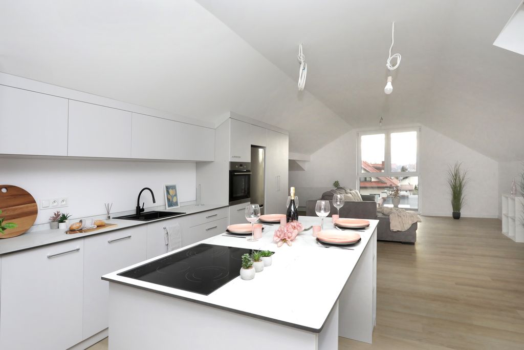 - Funkcjonalna kuchnia w zabudowie ze sprzętami AGD.
