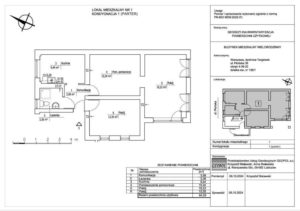 3-pokojowe mieszkanie po generalnym remoncie 64,29 m² Warszawa Targówek, ul. Płońska – parter z tarasem, idealne do życia i pod usługi