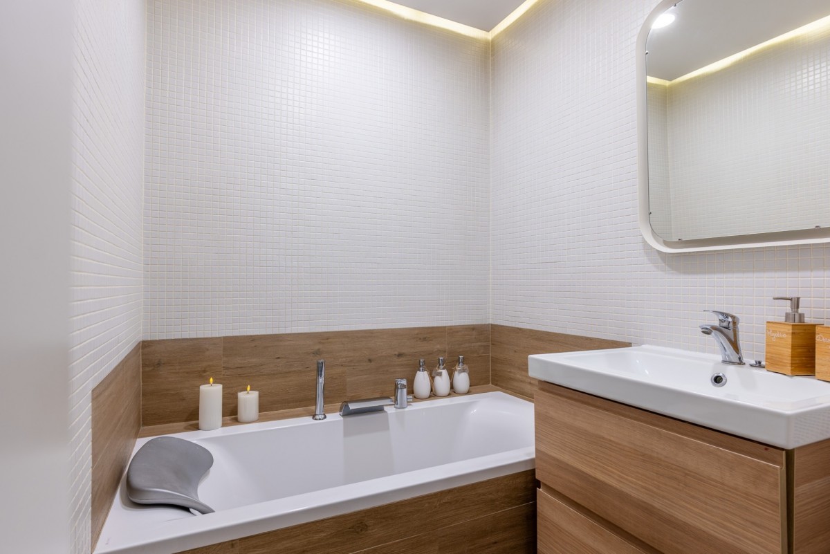 - Łazienka z wanną w eleganckim, ponadczasowym stylu.