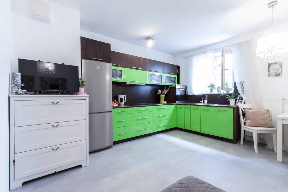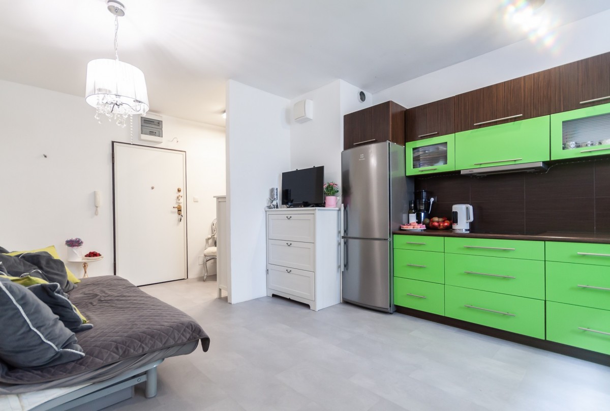 Salon połączony z kuchnią w pełni urządzoną i wyposażoną.