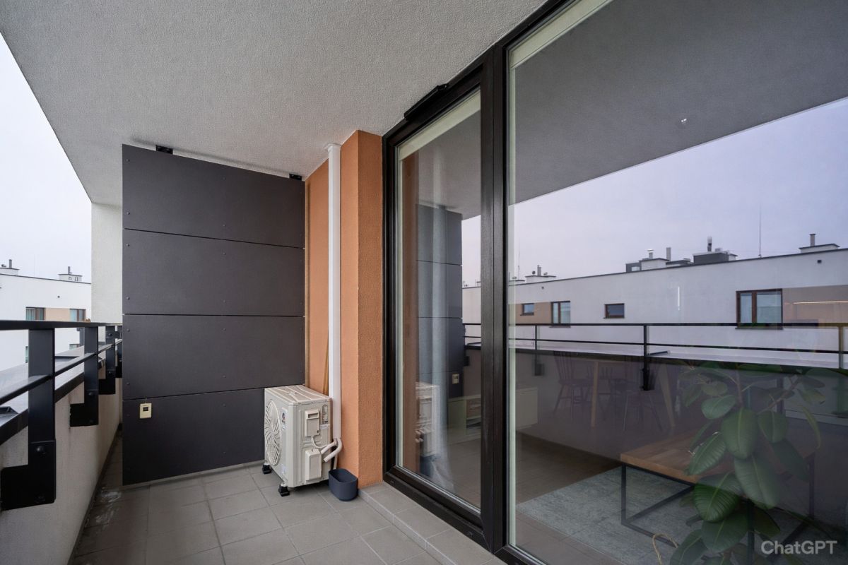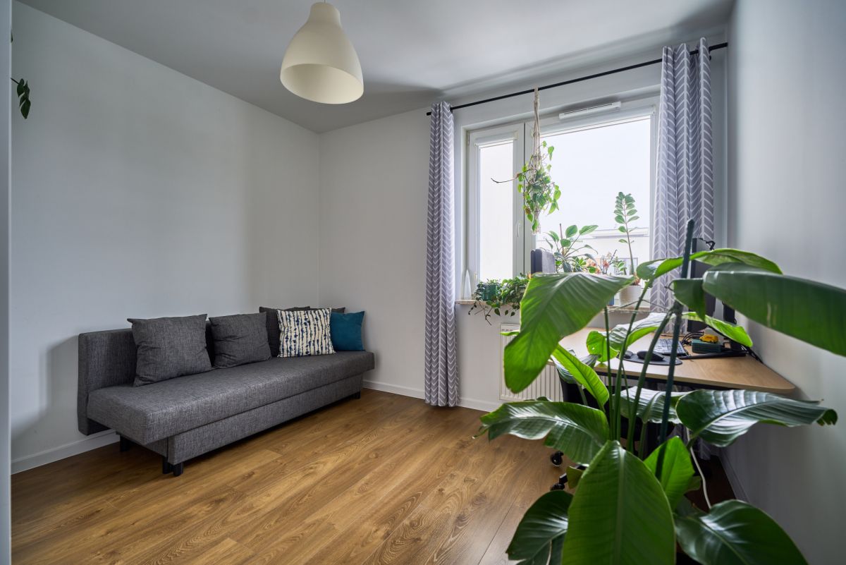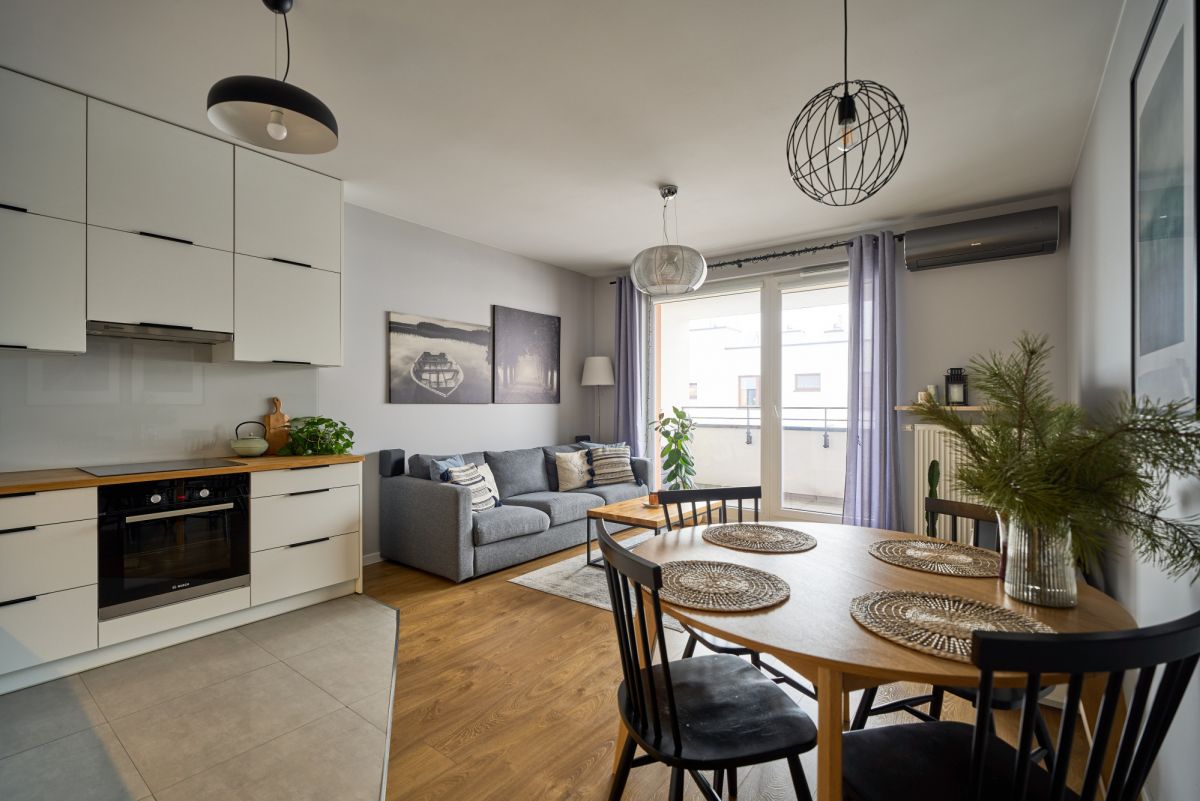 Lokal o powierzchni 59,5 m² składa się z 3 pokoi - w tym salonu z aneksem kuchennym (z którego wyjdziemy do loggii), łazienki i przedpokoju. Niekwestionowanym atutem nieruchomości jest zamontowana klimatyzacja, która podnosi komfort użytkowania w cieplejsze dni, jednocześnie dyskretnie wkomponowując się w urządzoną przestrzeń.