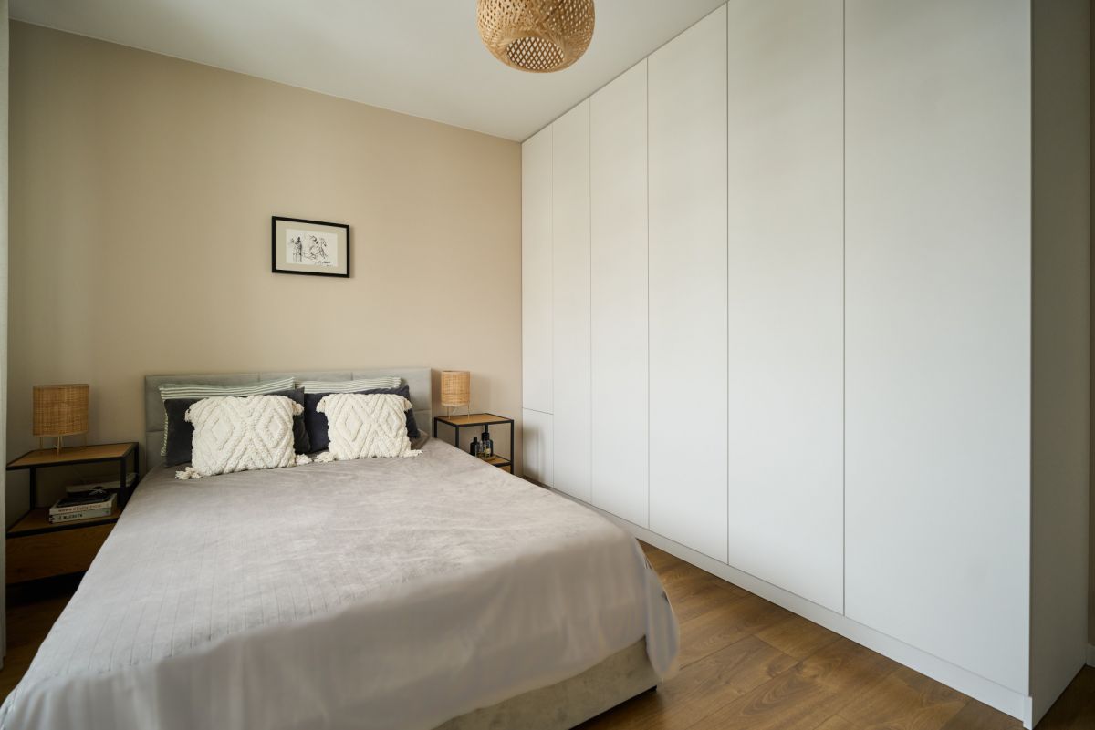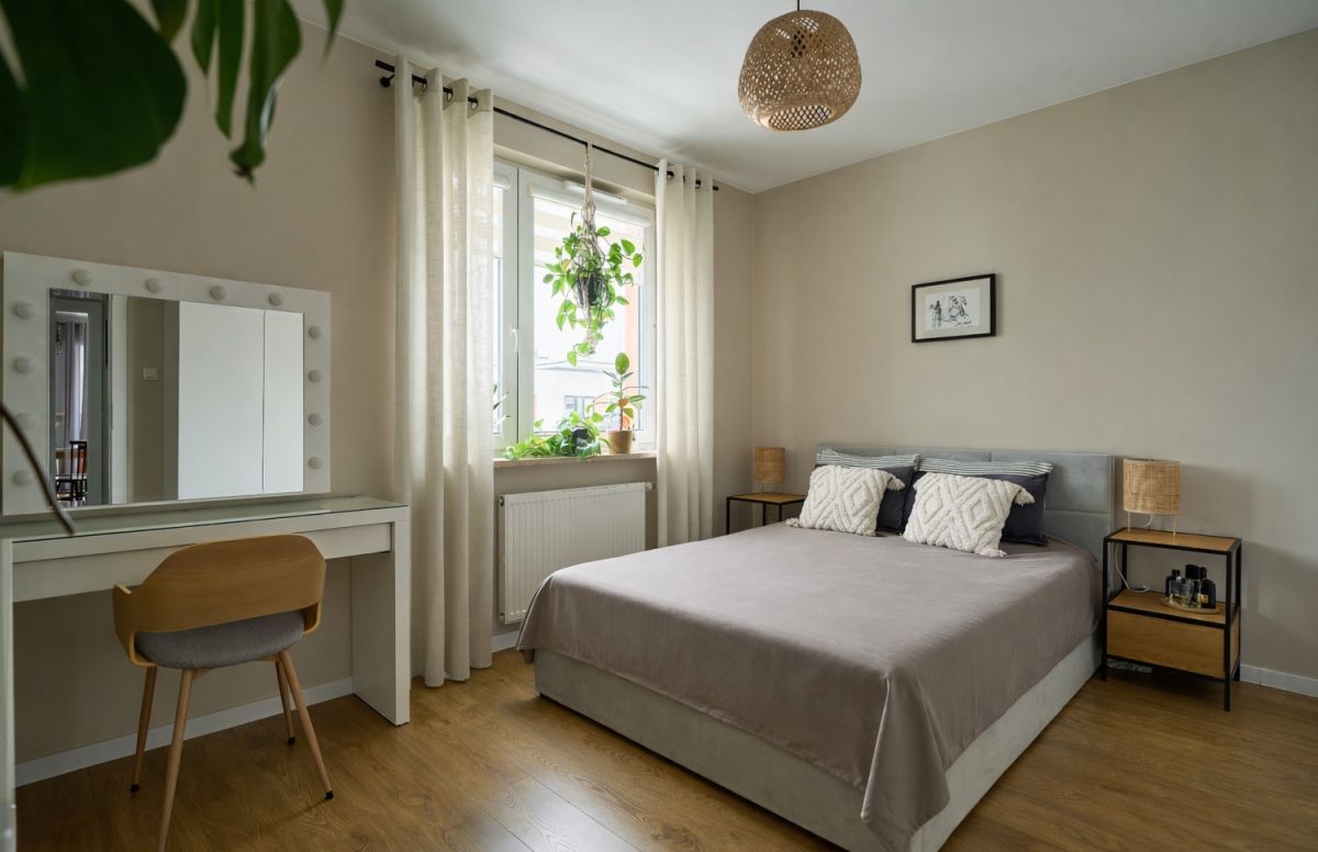 Sypialnia - Klimatycznie urządzona, z dużym łóżkiem sypialnianym tworzy prywatną przestrzeń idealną do wypoczynku. Wygospodarowane zostało również miejsce na toaletkę, w którym może stanąć biurko - zapewniając komfortowe miejsce do pracy. Duże i pojemne szafy wykonane na wymiar przez stolarza dopełniają przestrzeń i gwarantują dużo miejsca.