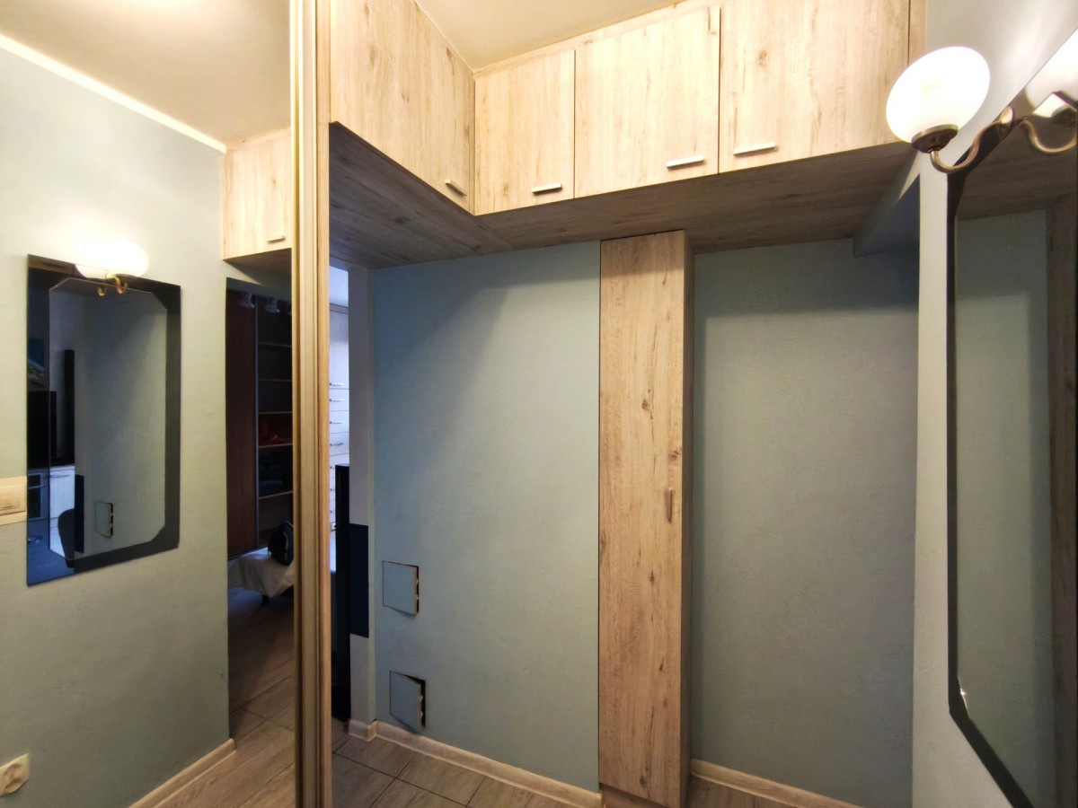 Przedpokój zabudowany szafkami.