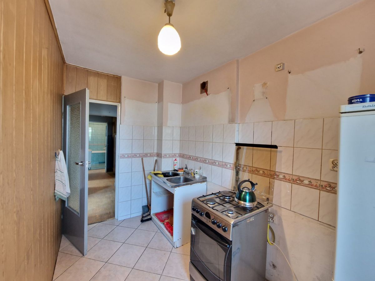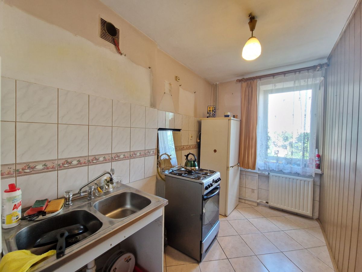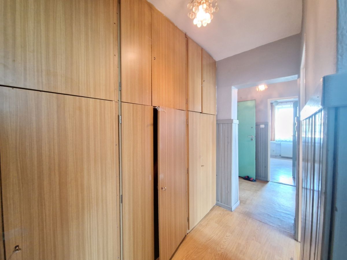 Ścianę między kuchnią, a dużym pokojem można zlikwidować, powiększając przestrzeń. Mieszkanie wymaga pełnego remontu.