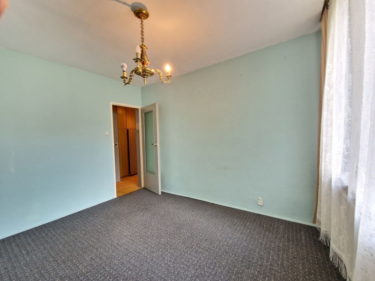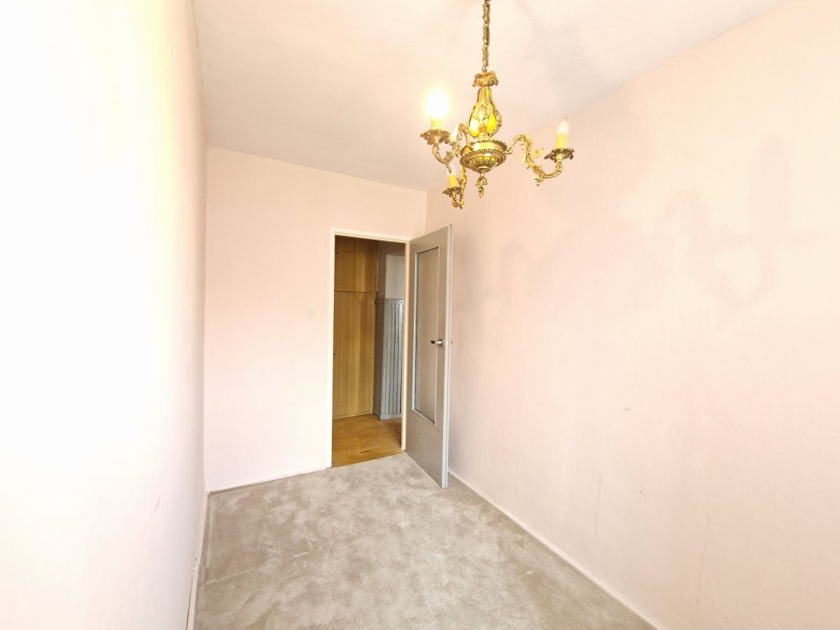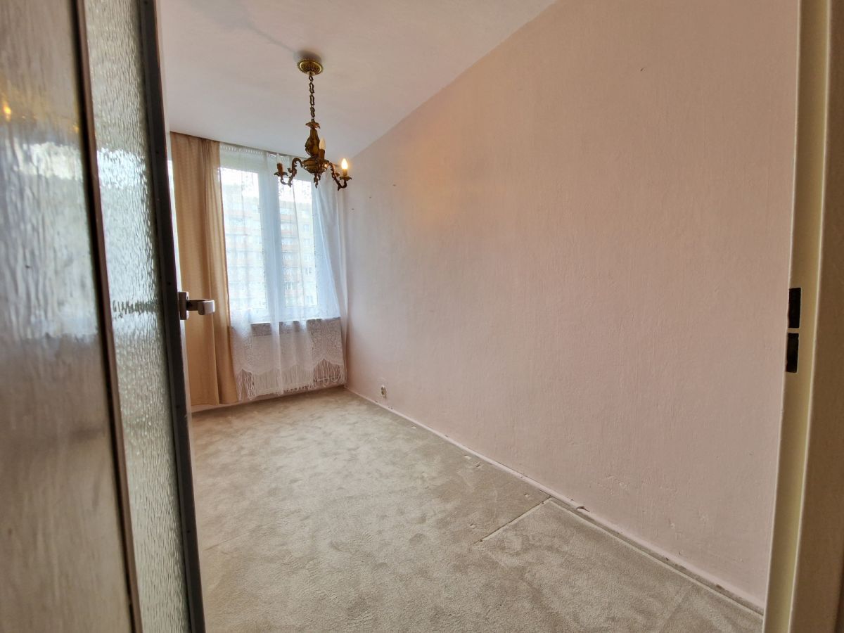 Ścianę między kuchnią, a dużym pokojem można zlikwidować, powiększając przestrzeń. Mieszkanie wymaga pełnego remontu.