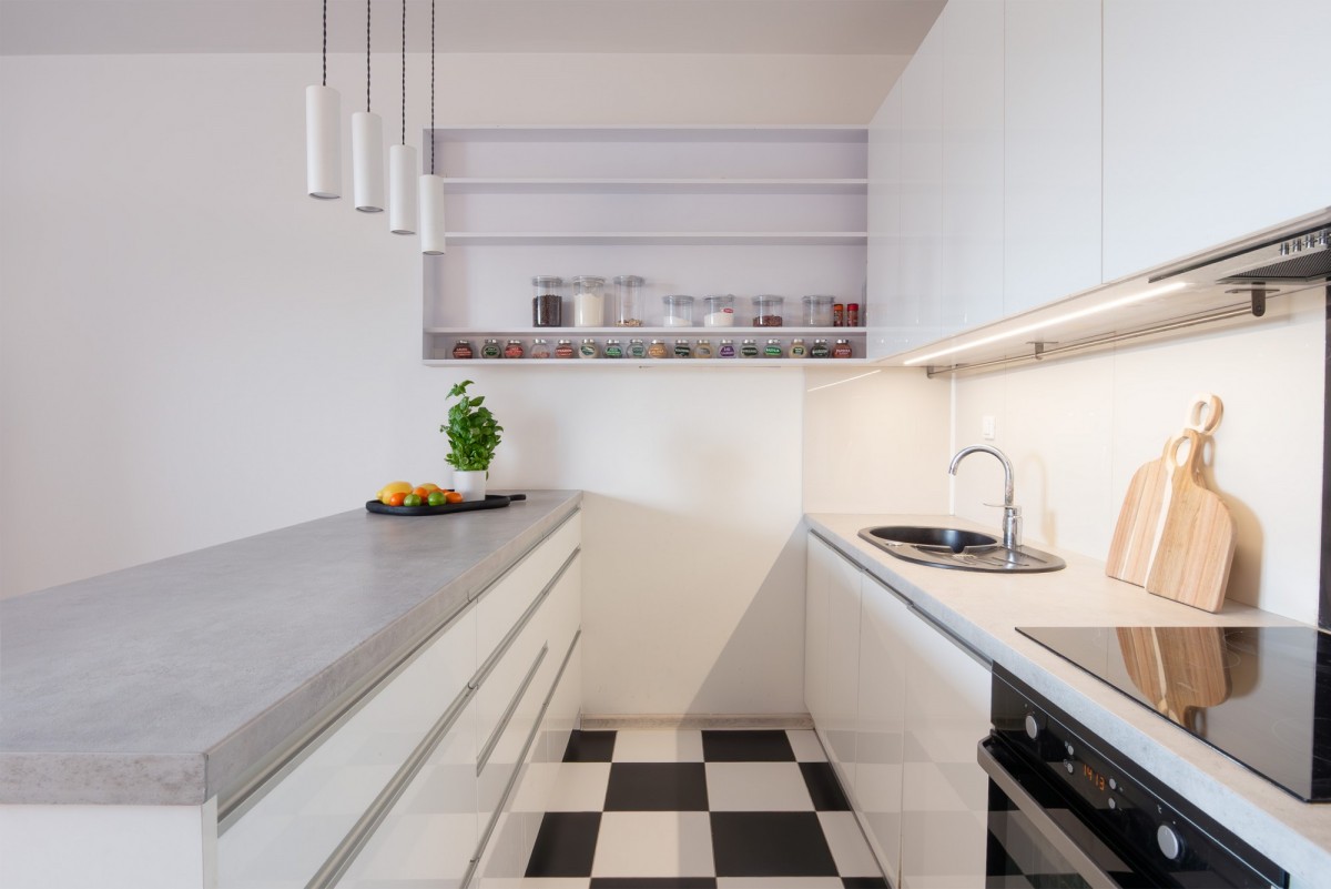 - Salon z otwartą kuchnią z aneksem kuchennym z wyspą