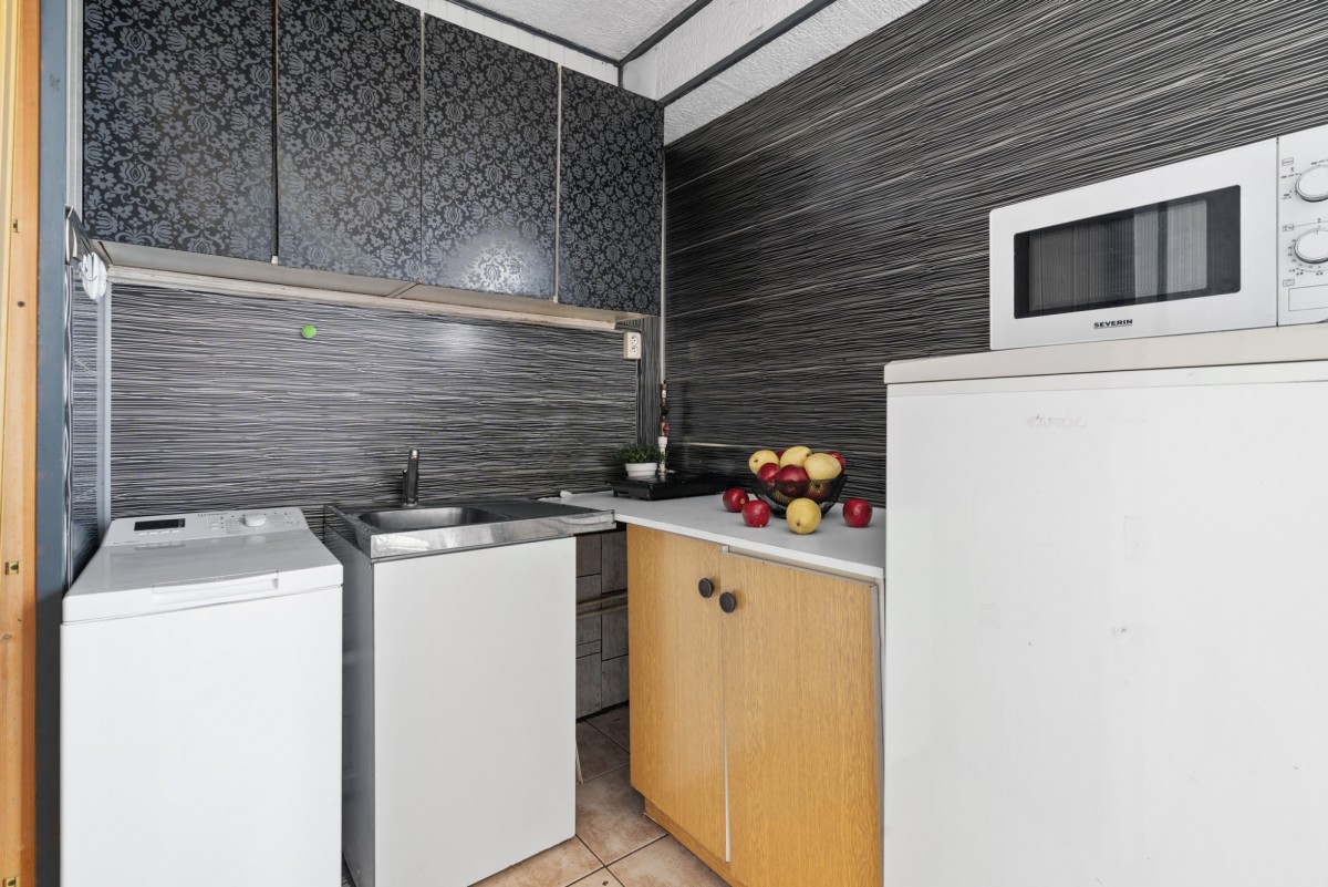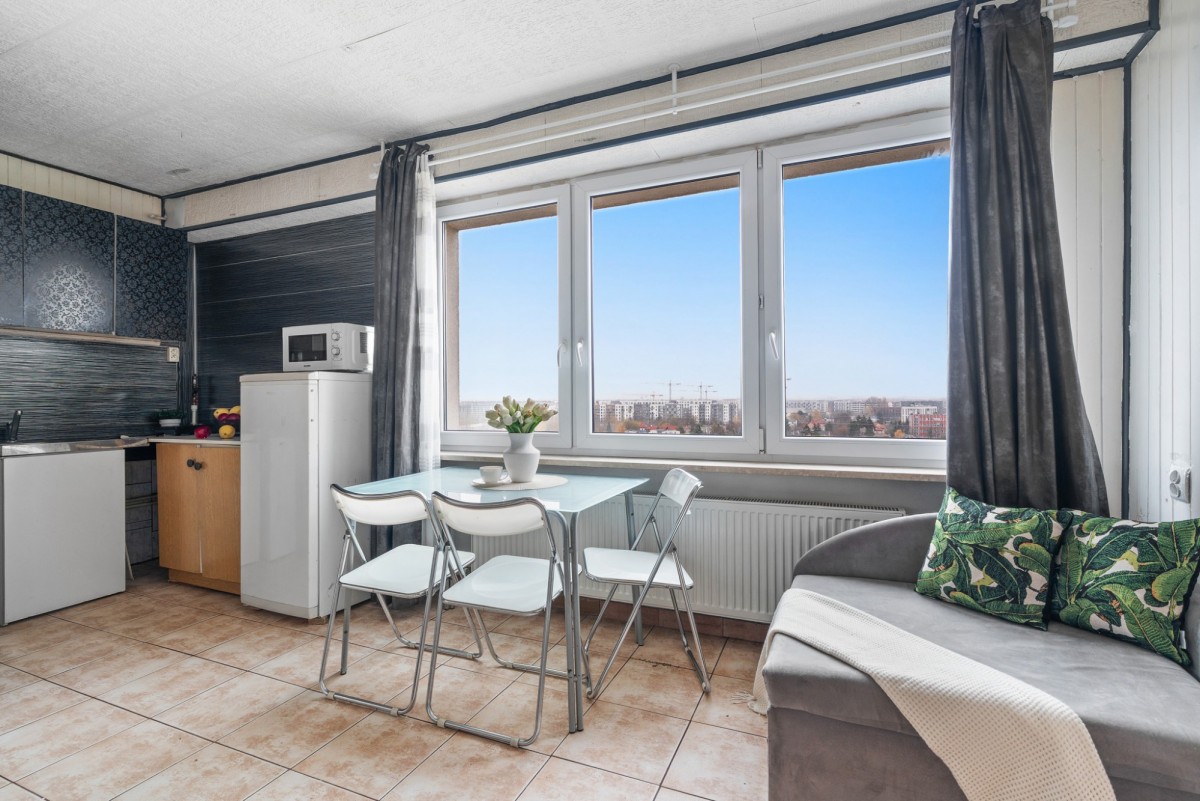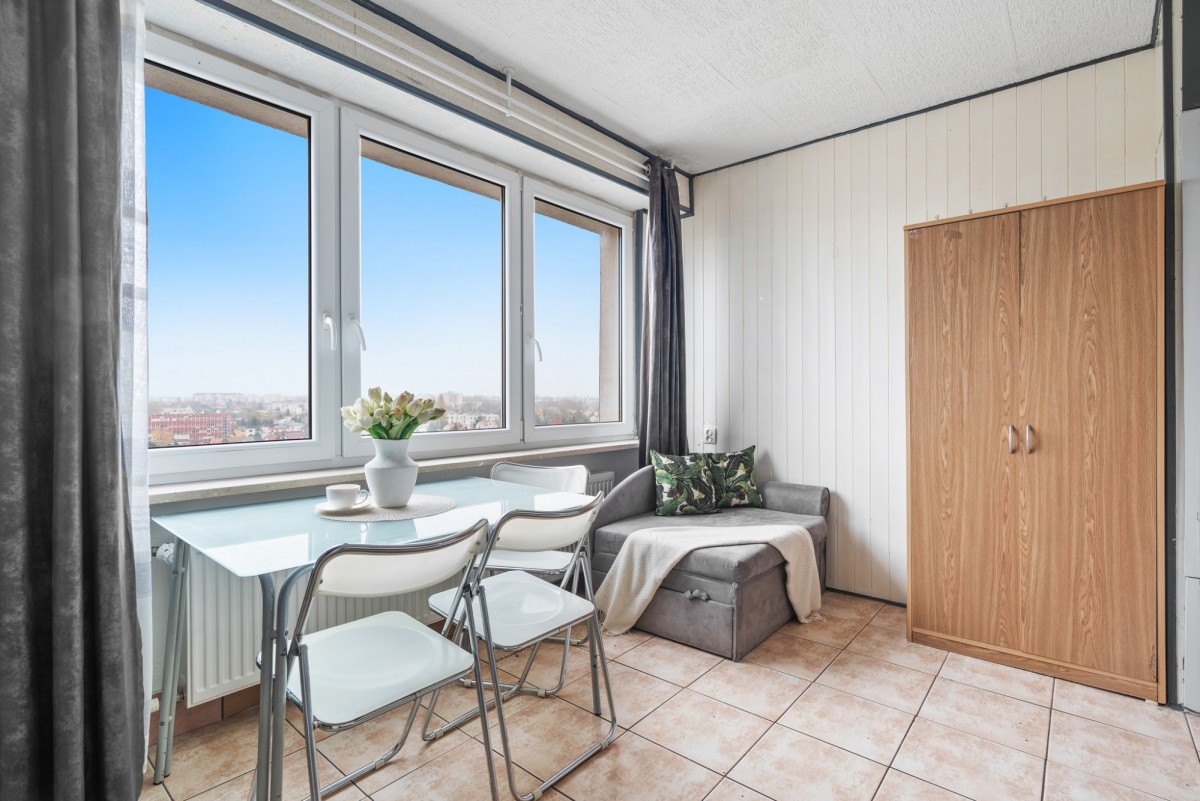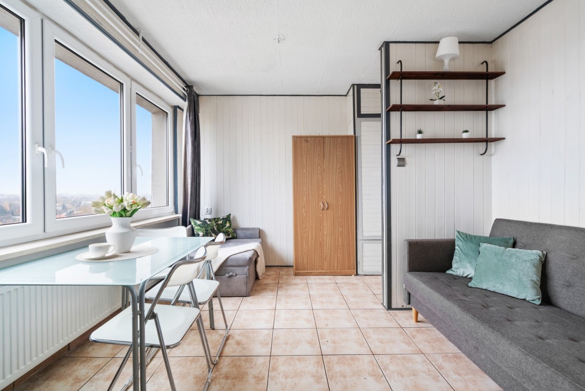 jasny, funkcjonalny pokój z aneksem kuchennym,