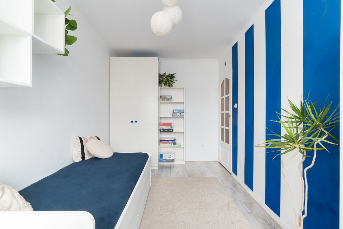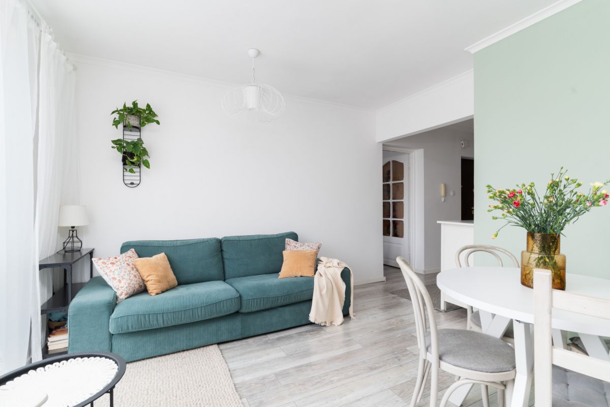 Aktualnie przemeblowany z wydzieloną strefą dzienną oraz strefą spania. Dzięki wyburzonej ściance przy wejściu salon zyskał dodatkową przestrzeń i jest niezwykle komfortowy oraz jasny.