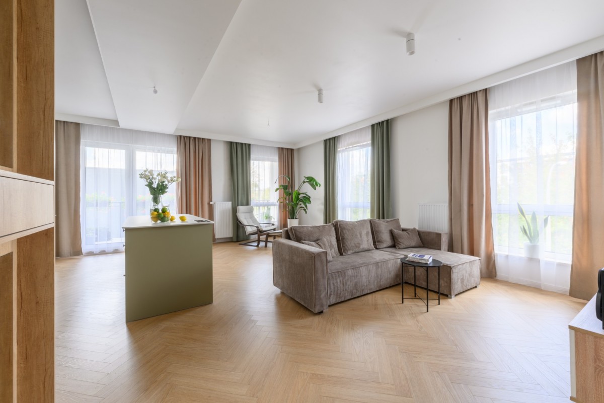 - Salon z aneksem kuchennym (37,18mkw) i wyjściem na balkon (16, 39 mkw) - idealne miejsce do wspólnego spędzania czasu, gotowania i relaksu.