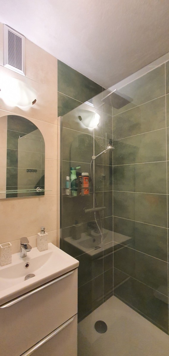 Osobna łazienka wyposażona w prysznic oraz osobna toaleta — to wygodne rozwiązanie przy trzech pokojach.