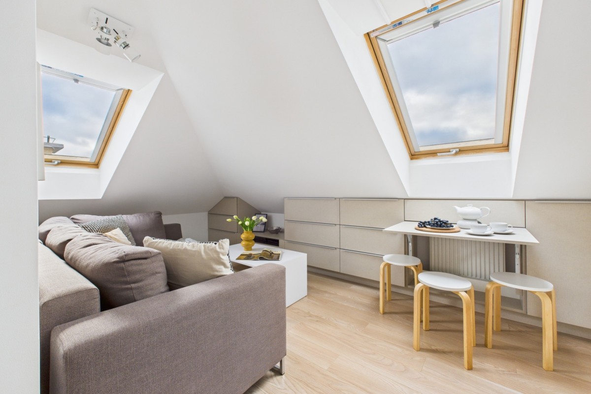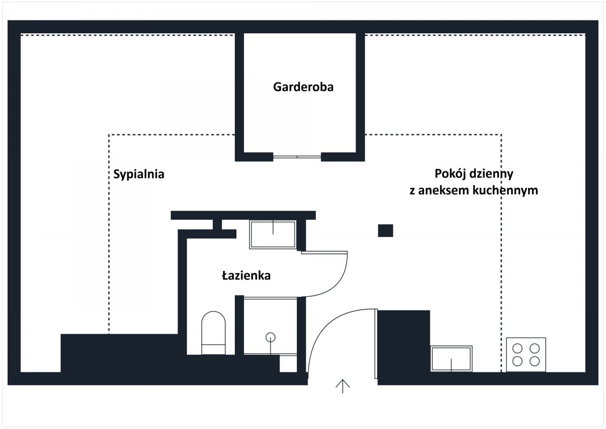 Poziom górny - ok. 13 m² (po podłodze znacznie więcej) - samodzielne studio z aneksem kuchennym i łazienką.