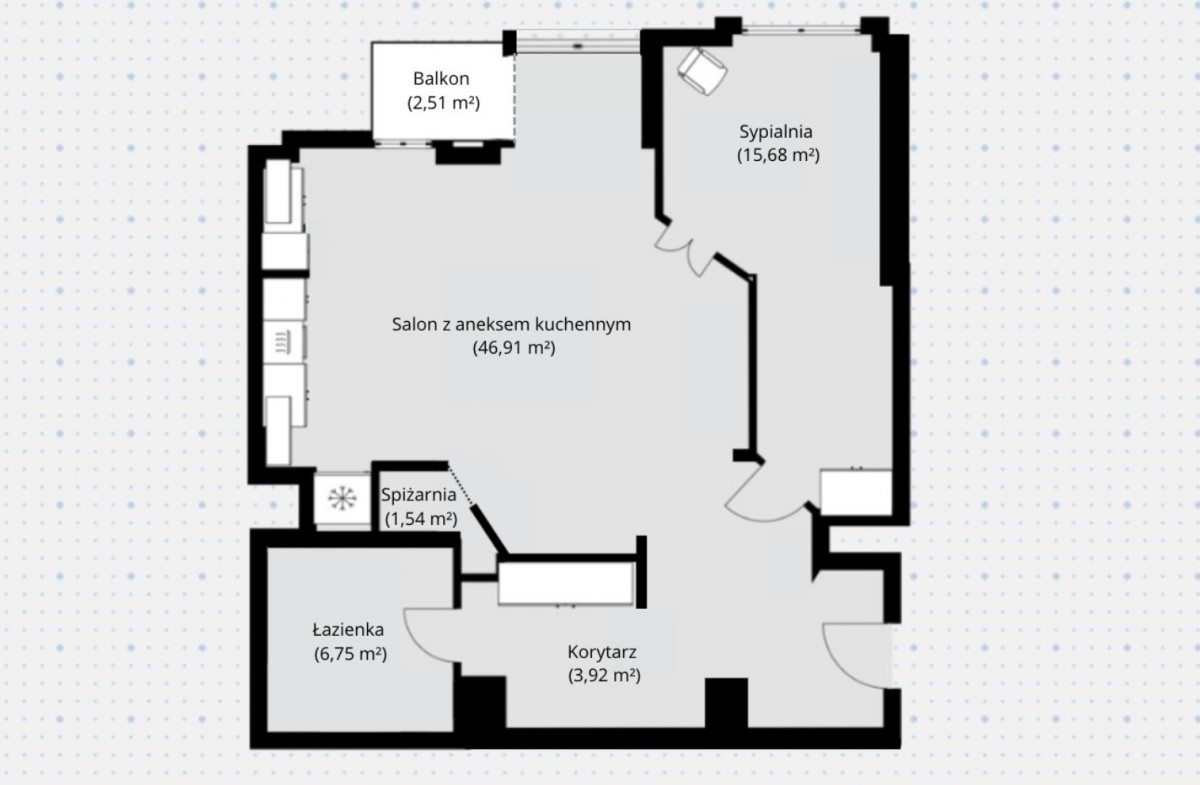 - salon z aneksem kuchennym, (46,91 m²) z wyjściem na balkon (2,51 m²),