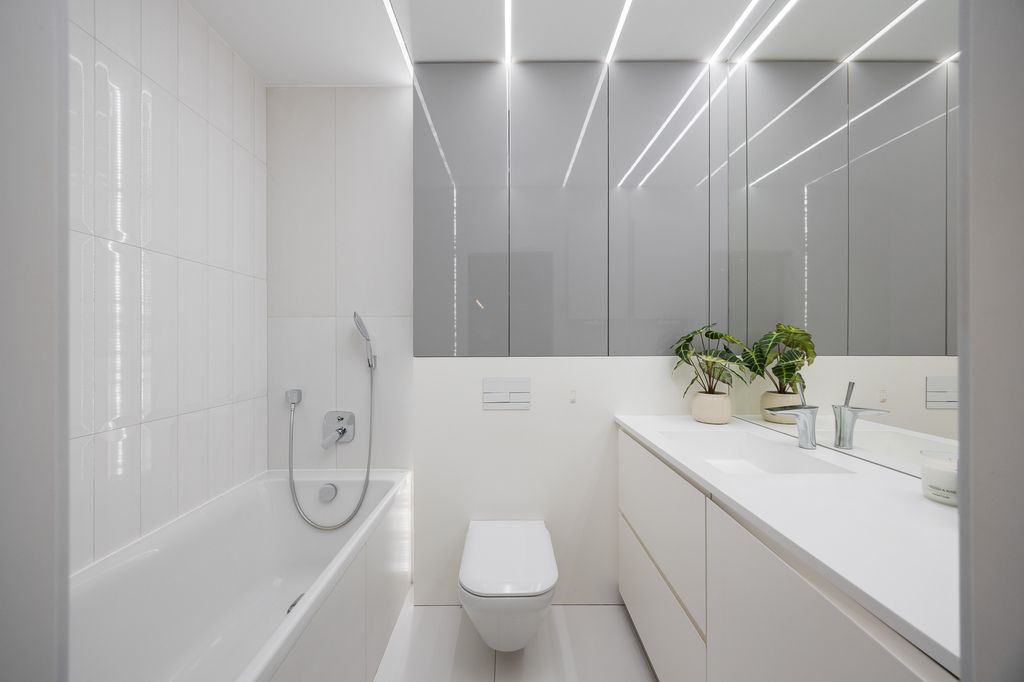 Sypialnia to ustawna, jasna przestrzeń z szafą w zabudowie. Zarówno w salonie, jak i w sypialni zamontowana jest klimatyzacja, zapewniająca komfort przez cały rok. Łazienka została wykończona w nowoczesnym stylu i wyposażona w wannę z baterią podtynkową. W mieszkaniu zastosowano nowoczesne oświetlenie LED.