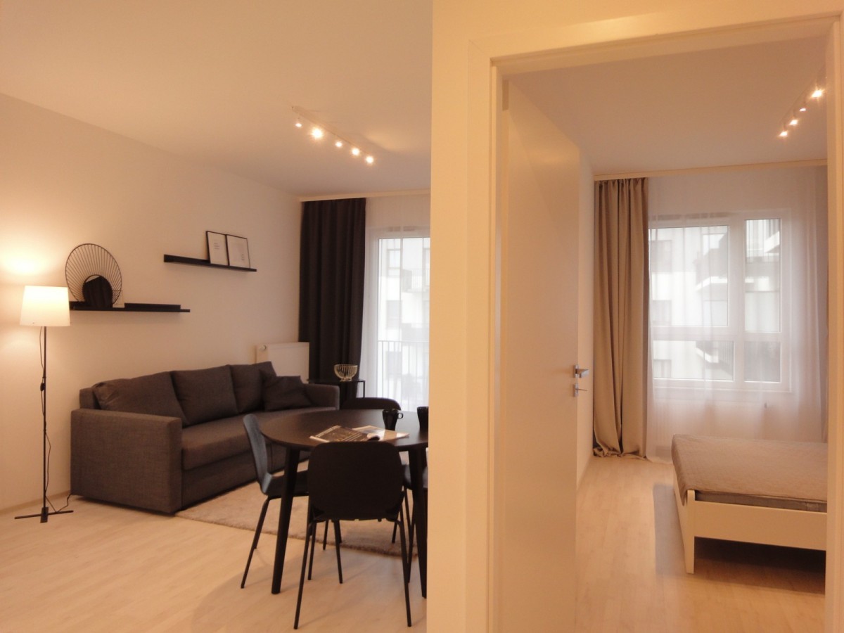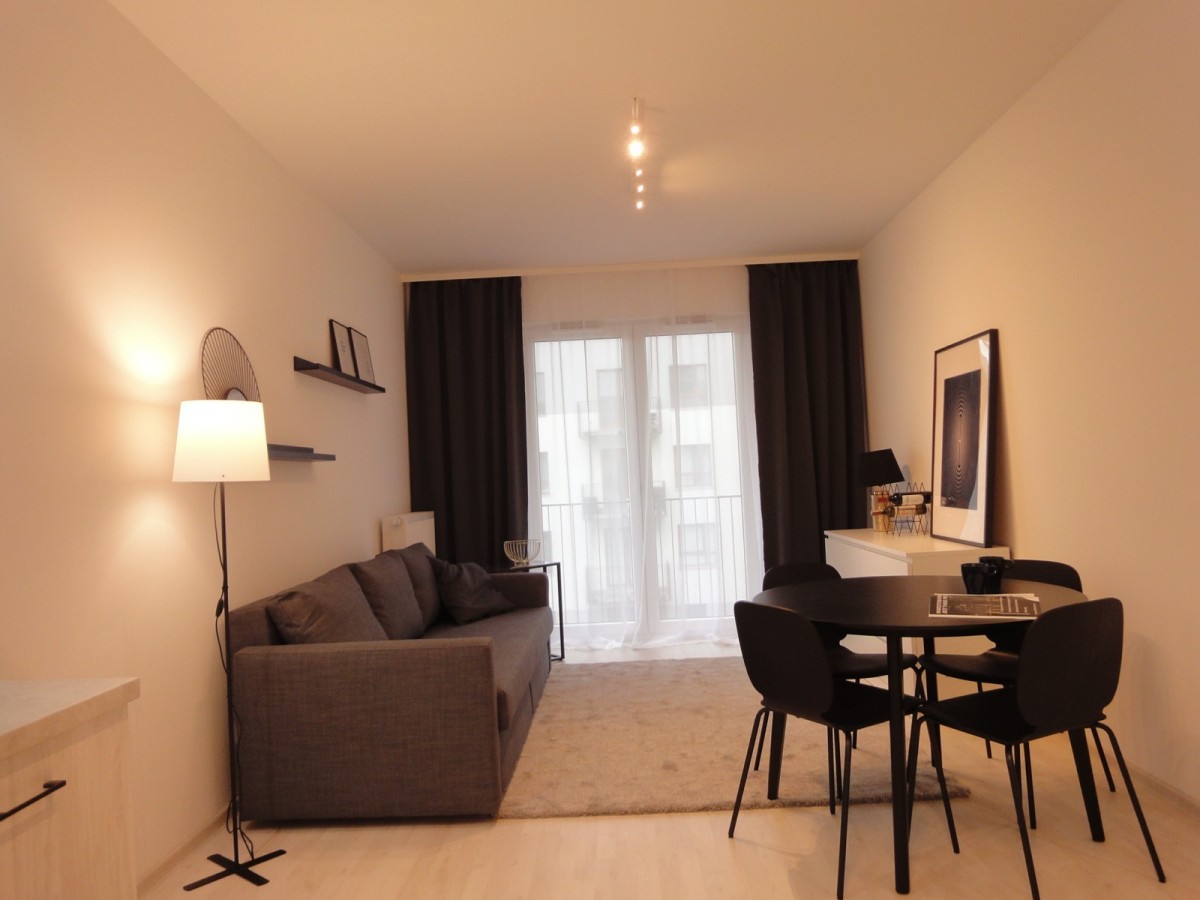 Mieszkanie znajduje się w nowym budynku, zostało niedawno wykończone i umeblowane nowymi meblami.