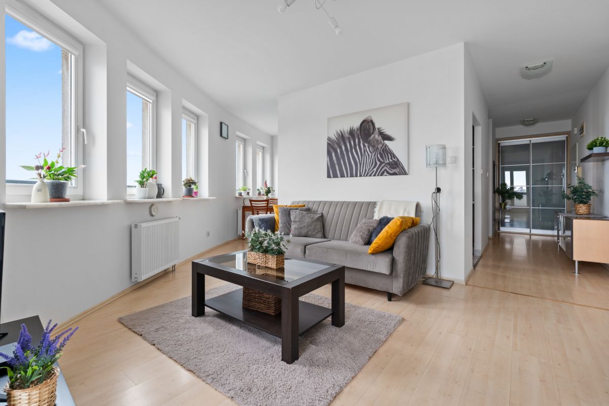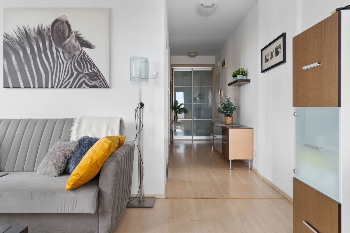 * Pełen światła salon z wyjściem na balkon i miejscem do pracy,