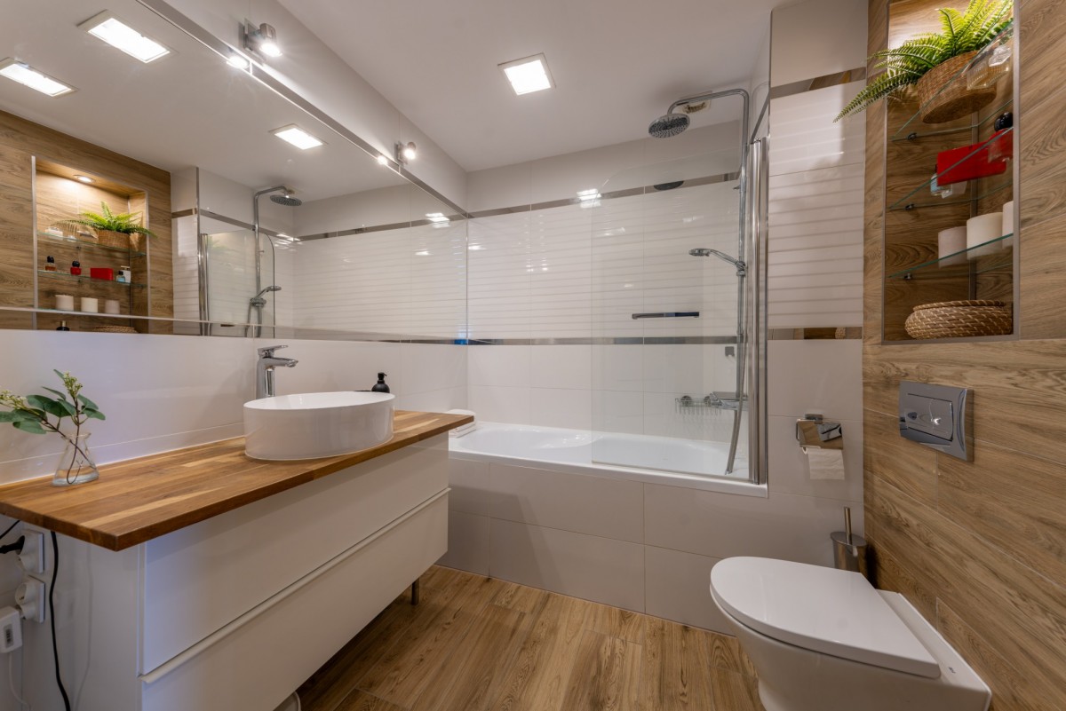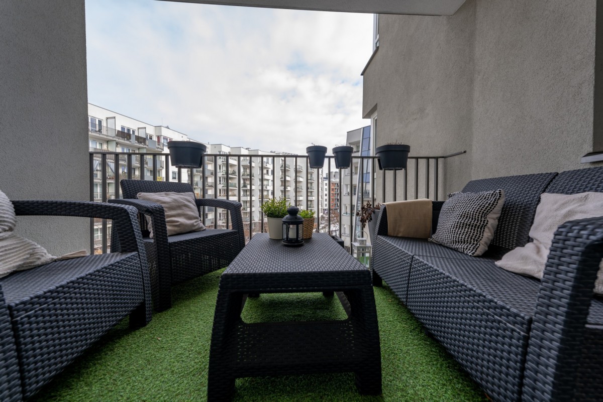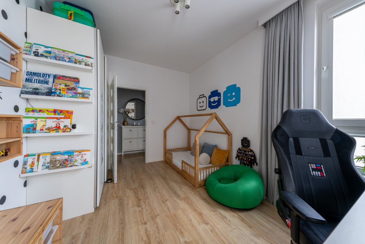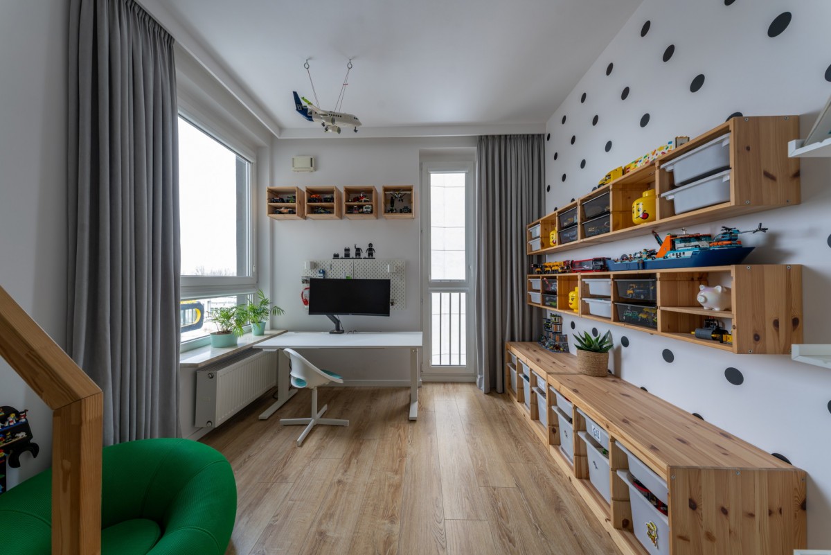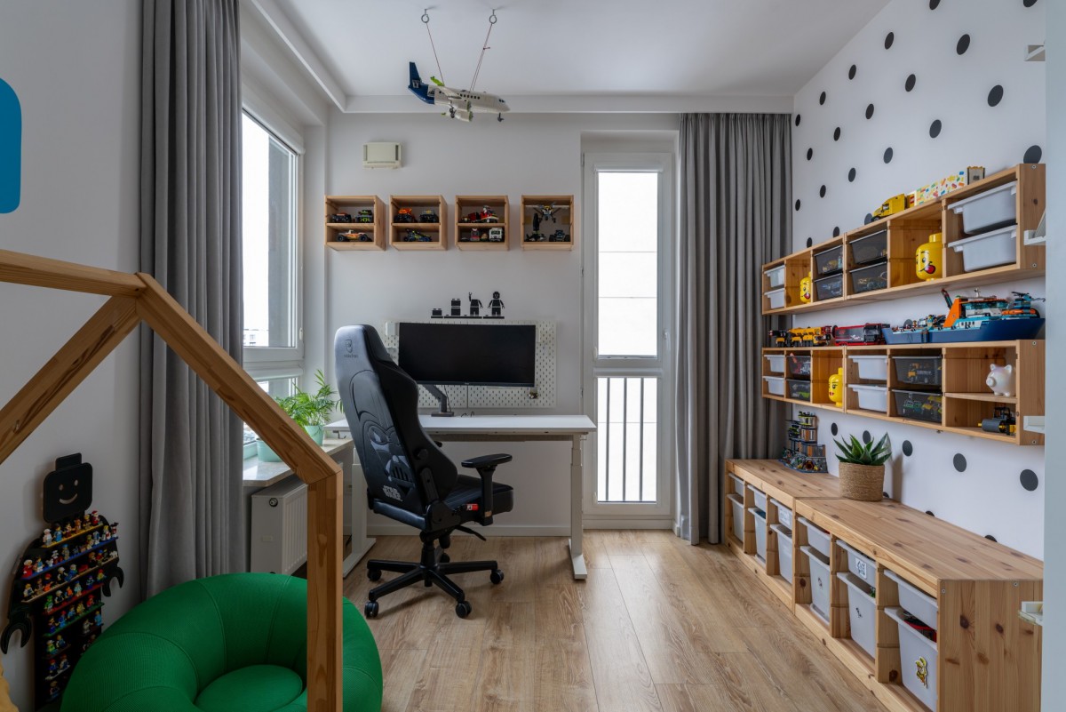 W sypialni i na przyległym do niej drugim balkonie zachwycają z kolei zachody słońca. W pokoju dziecięcym/gabinecie toczy się jeszcze inna historia. To miejsce na naukę, pracę zdalną (biurko o regulowanej wysokości), ale i odpoczynek. Łazienka z wanną i deszczownicą może zamienić zwykły wieczór w domowe SPA. Garderoba pełniąca też rolę pralni porządkuje codzienność, ale i daje możliwość stworzenia drugiej łazienki - na przyszłość, na nowe potrzeby.