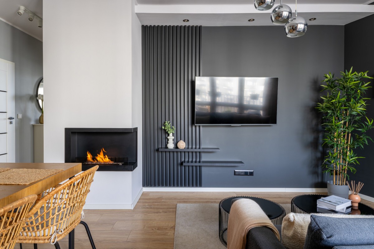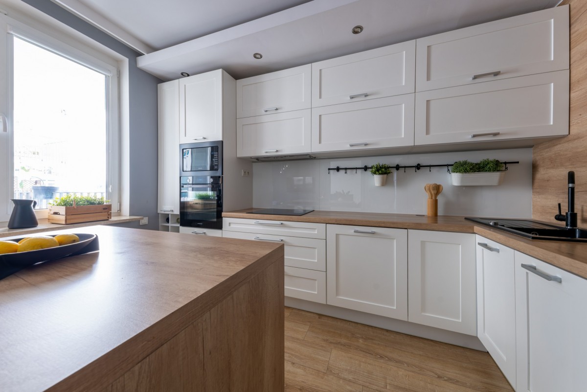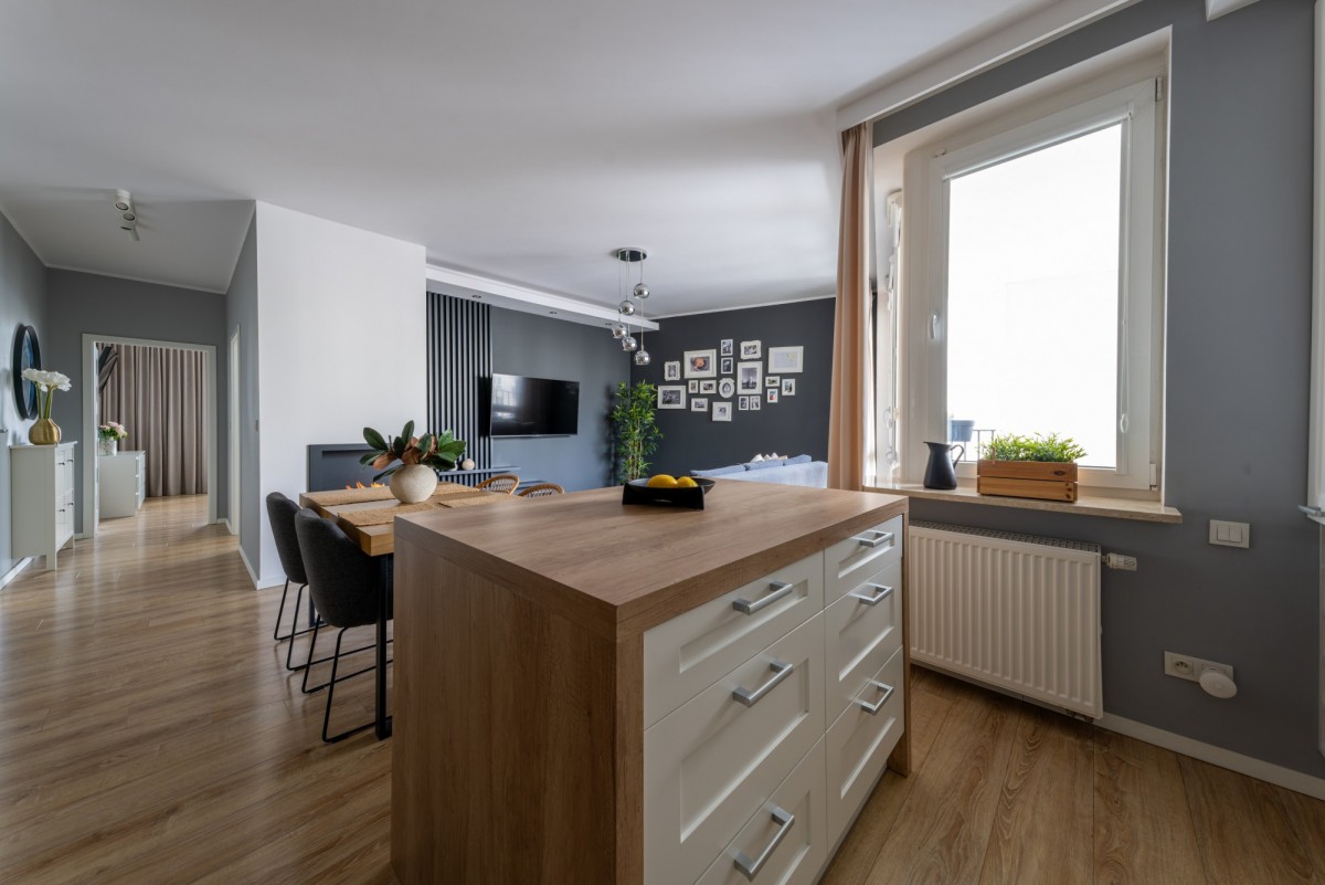 Wschodzące słońce delikatnie rozświetla salon. W kuchni parzy się kawa, a Ty wychodzisz na loggię, spoglądając na zielone patio, które jeszcze śpi. Jest cicho, spokojnie, dokładnie tak, jak lubisz. Wracasz do środka, gdzie ciepłem wita Cię przestronny salon z biokominkiem. To tutaj toczą się codzienne rozmowy, wspólne kolacje, wieczory z filmem czy weekendowe śniadania. Otwarta na salon, wykonana na wymiar kuchnia z wyspą jest elegancka, funkcjonalna i świetnie wyposażona. Niczego nie trzeba zmieniać - to miejsce tworzy kompletną całość.