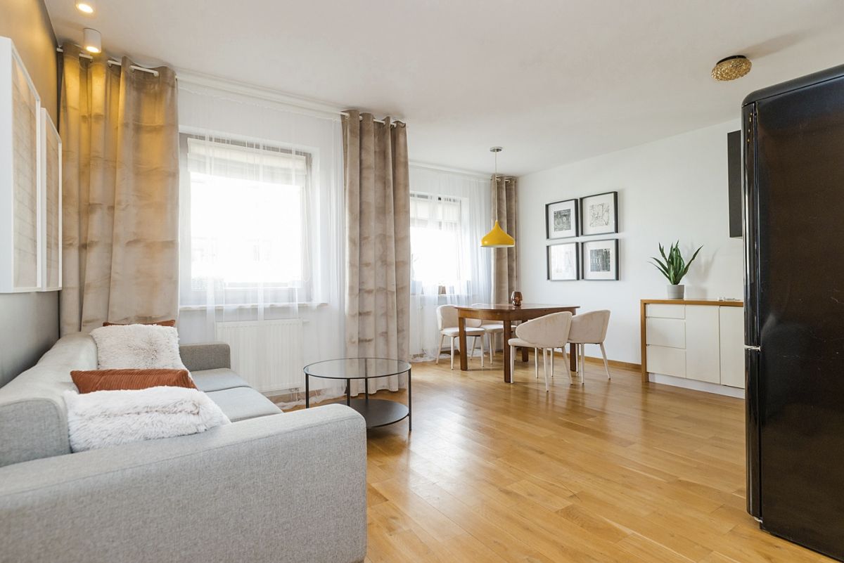 Mieszkanie jest jasne, zadbane i gotowe do zamieszkania. Duże okna zapewniają doskonałe doświetlenie wnętrz, a całość dopełnia naturalna dębowa podłoga oraz subtelne wykończenie inspirowane stylem retro, wprowadzające przytulny klimat. Układ mieszkania sprzyja wygodnemu życiu na co dzień, zarówno dla singla, pary, jak i osób pracujących zdalnie.
