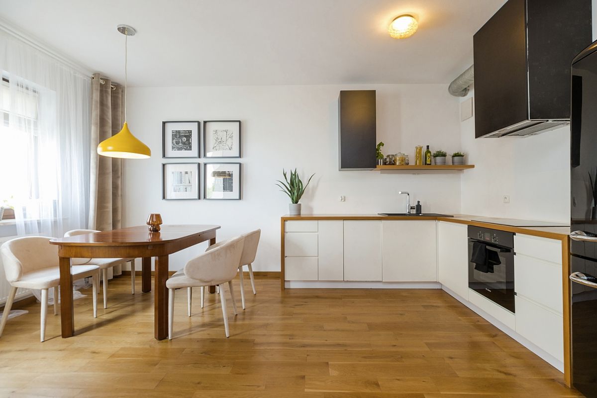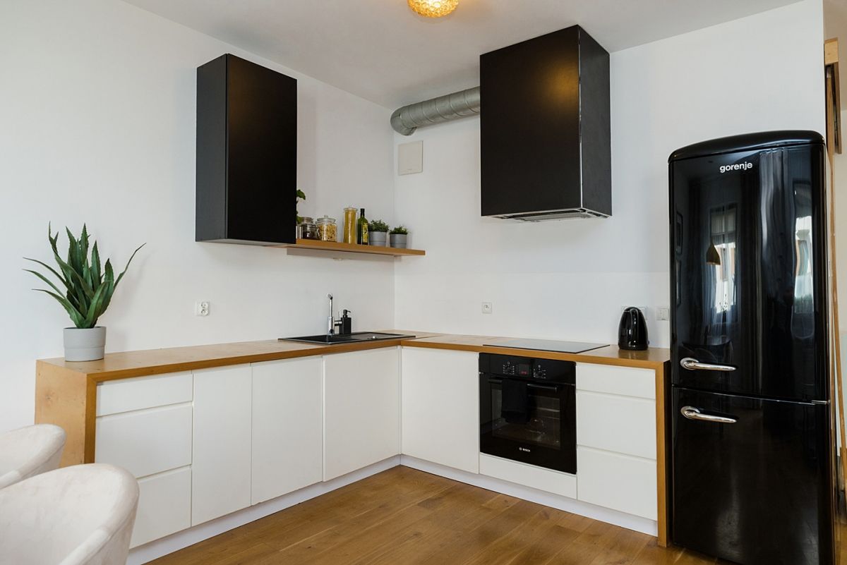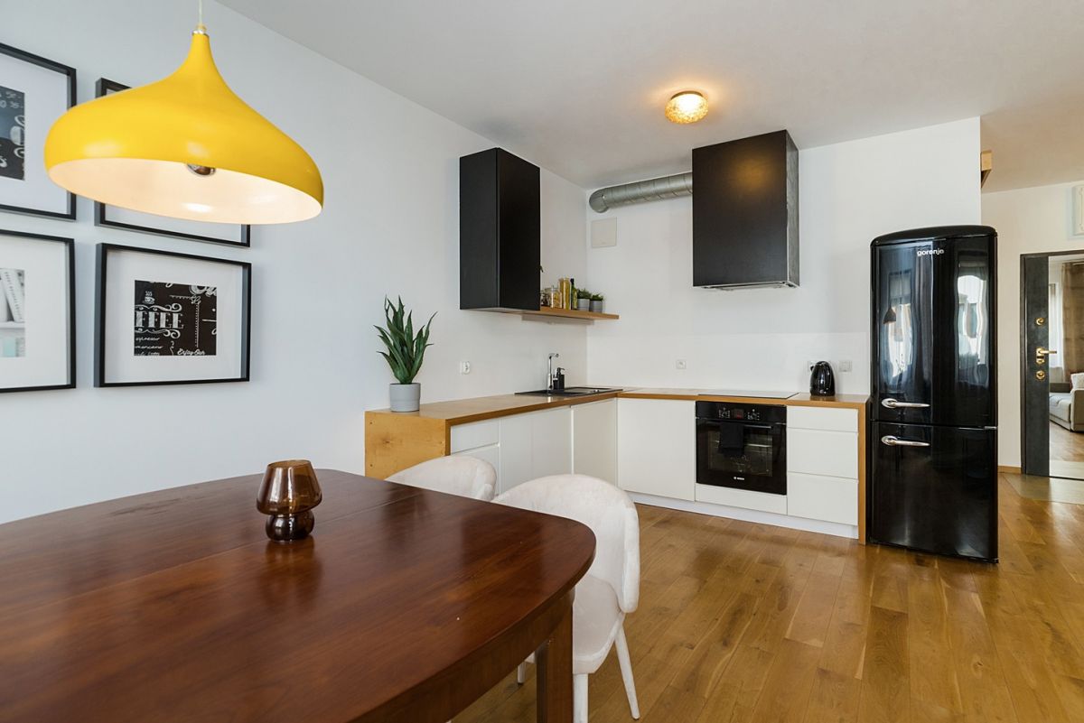 * kuchnia wyposażona we wszystkie niezbędne sprzęty AGD: lodówkę z zamrażarką, płytę indukcyjną, piekarnik oraz zmywarkę (wszystkie urządzenia sprawne i gotowe do użytkowania),